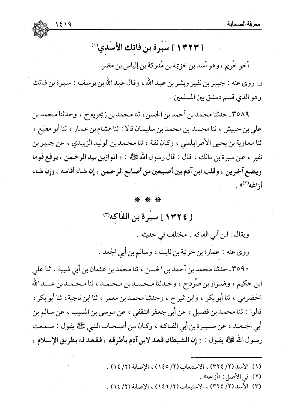 ٣٥٩٠ - حَدَّثَنَا مُحَمَّدُ بْنُ أَحْمَدَ بْنِ الْحَسَنِ، ثنا مُحَمَّدُ بْنُ عُثْمَانَ بْنِ أَبِي شَيْبَةَ، ثنا عَلِيُّ بْنُ حَكِيمٍ، وَضِرَارُ بْنُ صُرَدَ ح، وَحَدَّثَنَا مُحَمَّدُ بْنُ مُحَمَّدٍ، ثنا مُحَمَّدُ بْنُ عَبْدِ اللهِ الْحَضْرَمِيُّ، ثنا أَبُو بَكْرٍ، وَابْنُ نُمَيْرٍ ح وَحَدَّثَنَا مُحَمَّدُ بْنُ مَعْمَرٍ، ثنا ابْنُ نَاجِيَةَ، ثنا أَبُو بَكْرٍ، قَالُوا: ثنا مُحَمَّدُ بْنُ فُضَيْلٍ، عَنْ أَبِي جَعْفَرٍ الثَّقَفِيِّ، عَنْ مُوسَى بْنِ الْمُسَيَّبِ، عَنْ سَالِمِ بْنِ أَبِي الْجَعْدِ، عَنْ سَبْرَةَ بْنِ أَبِي الْفَاكِهِ، وَكَانَ مِنْ أَصْحَابِ النَّبِيِّ صَلَّى اللَّهُ عَلَيْهِ وَسَلَّمَ يَقُولُ: سَمِعْتُ رَسُولَ اللهِ صَلَّى اللَّهُ عَلَيْهِ وَسَلَّمَ يَقُولُ: " إِنَّ الشَّيْطَانَ قَعَدَ لِابْنِ آدَمَ بِأَطْرُقِهِ، فَقَعَدَ لَهُ بِطَرِيقِ الْإِسْلَامِ ⦗١٤٢٠⦘ فَقَالَ: تُسْلِمُ وَتَدَعُ دِينَكَ وَدِينَ آبَائِكَ، ثُمَّ قَعَدَ لَهُ بِطَرِيقِ الْهِجْرَةِ فَقَالَ: تُهَاجِرُ وَتَدَعُ مَوْلِدَكَ، فَتَكُونَ كَالْفَرَسِ فِي طِوَلِهِ، ثُمَّ قَعَدَ لَهُ بِطَرِيقِ الْجِهَادِ فَقَالَ: تُجَاهِدُ وَتُقْتَلُ، فَتَتَزَوَّجَ امْرَأَتُكَ، وَيُقَسَّمَ مَالُكَ " فَقَالَ رَسُولُ اللهِ صَلَّى اللَّهُ عَلَيْهِ وَسَلَّمَ: «فَمَنْ فَعَلَ ذَلِكَ ضَمِنَ اللهُ لَهُ الْجَنَّةَ» رَوَاهُ طَارِقُ بْنُ عَبْدِ الْعَزِيزِ، عَنِ ابْنِ عَجْلَانَ، عَنْ مُوسَى، عَنْ سَالِمٍ فَقَالَ: عَنْ جَابِرِ بْنِ أَبِي سَبْرَةَ