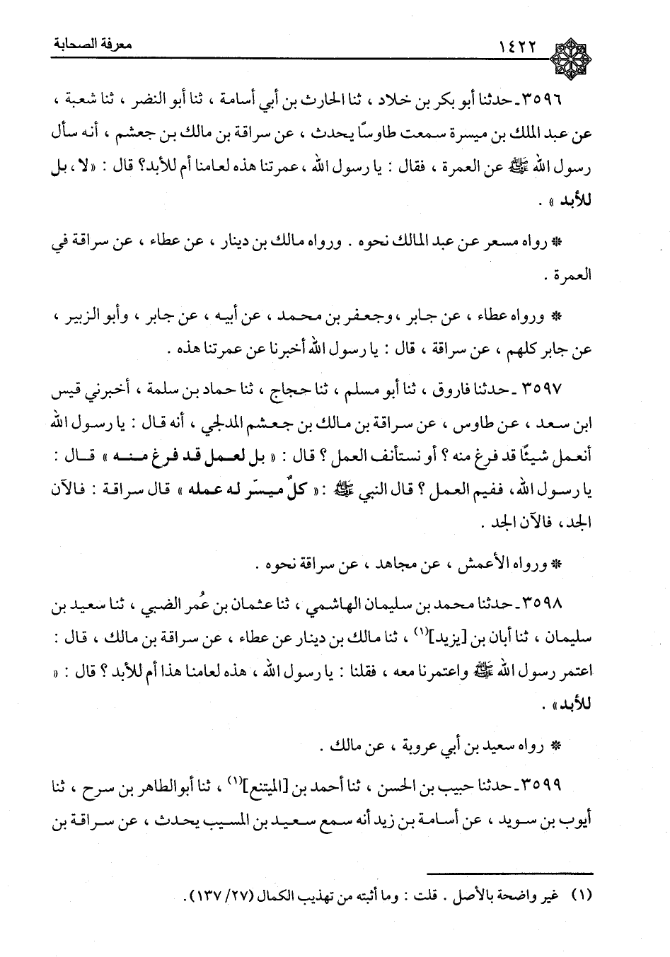 ٣٥٩٦ - حَدَّثَنَا أَبُو بَكْرِ بْنُ خَلَّادٍ، ثنا الْحَارِثُ بْنُ أَبِي أُسَامَةَ، ثنا أَبُو النَّضْرِ، ثنا شُعْبَةُ، عَنْ عَبْدِ الْمَلِكِ بْنِ مَيْسَرَةَ، سَمِعْتُ طَاوُسًا، يُحَدِّثُ عَنْ سُرَاقَةَ بْنِ مَالِكِ بْنِ جُعْشُمٍ، أَنَّهُ سَأَلَ رَسُولَ اللهِ صَلَّى اللَّهُ عَلَيْهِ وَسَلَّمَ عَنِ الْعُمْرَةِ فَقَالَ: يَا رَسُولَ اللهِ، عُمْرَتُنَا هَذِهِ لِعَامِنَا أَمْ لِلْأَبَدِ؟ قَالَ: «لَا، بَلْ لِلْأَبَدِ» رَوَاهُ مِسْعَرُ عَنْ عَبْدِ الْمَالِكِ نَحْوَهُ، وَرَوَاهُ مَالِكُ بْنُ دِينَارٍ، عَنْ عَطَاءٍ، عَنْ سُرَاقَةَ فِي الْعُمْرَةِ، وَرَوَاهُ عَطَاءٌ، عَنْ جَابِرٍ، وَجَعْفَرُ بْنُ مُحَمَّدٍ، عَنْ أَبِيهِ، عَنْ جَابِرٍ، وَأَبُو الزُّبَيْرِ، عَنْ جَابِرٍ كُلُّهُمْ، عَنْ سُرَاقَةَ قَالَ: يَا رَسُولَ اللهِ أَخْبِرْنَا عَنْ عُمْرَتِنَا هَذِهِ