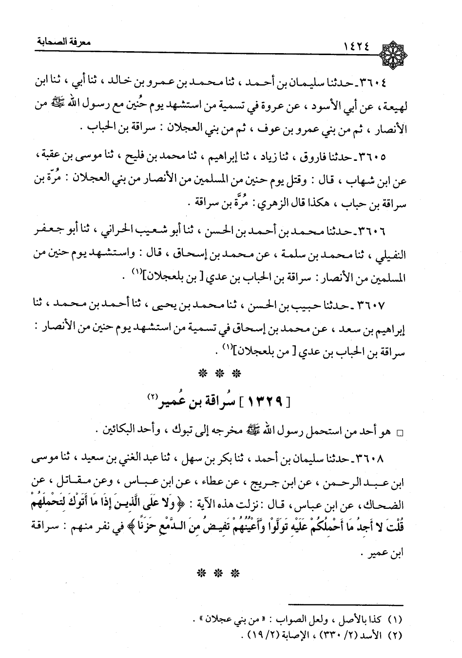 ٣٦٠٥ - حَدَّثَنَا فَارُوقٌ، ثنا زِيَادٌ، ثنا إِبْرَاهِيمُ، ثنا مُحَمَّدُ بْنُ فُلَيْحٍ، ثنا مُوسَى بْنُ عُقْبَةَ، عَنِ ابْنِ شِهَابٍ، قَالَ: " وَقُتِلَ يَوْمَ حُنَيْنٍ مِنَ الْمُسْلِمِينَ مِنَ الْأَنْصَارِ مِنْ بَنِي الْعَجْلَانِ: مُرَّةُ بْنُ سُرَاقَةَ بْنِ حُبَابٍ "، هَكَذَا قَالَ الزُّهْرِيُّ: مُرَّةُ بْنُ سُرَاقَةَ