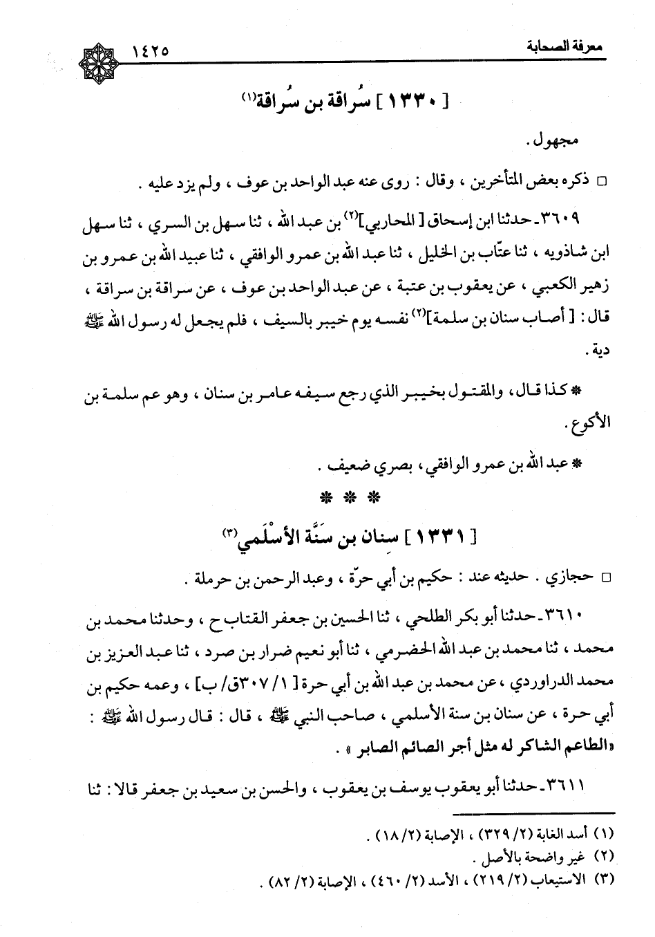 ٣٦١٠ - حَدَّثَنَا أَبُو بَكْرٍ الطَّلْحِيُّ، ثنا الْحُسَيْنُ بْنُ جَعْفَرٍ الْقَتَّابُ، ح وَحَدَّثَنَا مُحَمَّدُ بْنُ مُحَمَّدٍ، ثنا مُحَمَّدُ بْنُ عَبْدِ اللهِ الْحَضْرَمِيُّ، ثنا أَبُو نُعَيْمٍ ضِرَارُ بْنُ صُرَدَ، ثنا عَبْدُ الْعَزِيزِ بْنُ مُحَمَّدٍ الدَّرَاوَرْدِيُّ، عَنْ مُحَمَّدِ بْنِ عَبْدِ اللهِ بْنِ أَبِي حُرَّةَ، وَعَمِّهِ، حَكِيمِ بْنِ أَبِي حُرَّةَ، عَنْ سِنَانِ بْنِ سَنَّةَ الْأَسْلَمِيِّ، صَاحِبِ النَّبِيِّ صَلَّى اللَّهُ عَلَيْهِ وَسَلَّمَ قَالَ: قَالَ رَسُولُ اللهِ صَلَّى اللَّهُ عَلَيْهِ وَسَلَّمَ: «الطَّاعِمُ الشَّاكِرُ لَهُ مِثْلُ أَجْرِ الصَّائِمِ الصَّابِرِ»