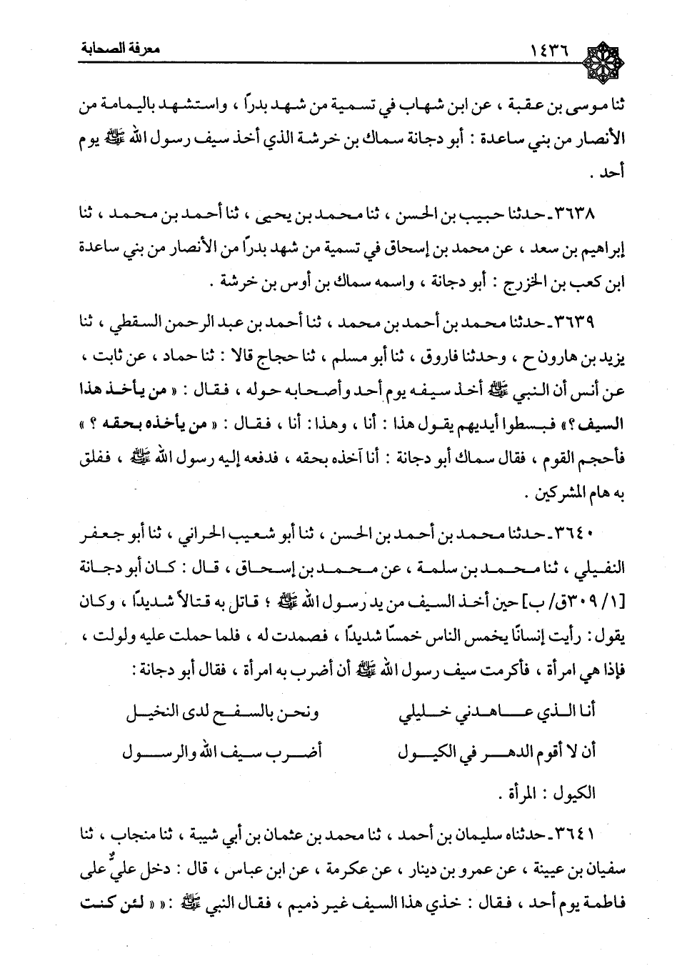 ٣٦٣٩ - حَدَّثَنَا مُحَمَّدُ بْنُ أَحْمَدَ بْنِ مُحَمَّدٍ، ثنا أَحْمَدُ بْنُ عَبْدِ الرَّحْمَنِ السَّقَطِيُّ، ثنا يَزِيدُ بْنُ هَارُونَ، ح وَحَدَّثَنَا فَارُوقٌ، ثنا أَبُو مُسْلِمٍ، ثنا حَجَّاجٌ، قَالَا: ثنا حَمَّادٌ، عَنْ ثَابِتٍ، عَنْ أَنَسٍ، أَنَّ النَّبِيَّ صَلَّى اللَّهُ عَلَيْهِ وَسَلَّمَ أَخَذَ سَيْفَهُ يَوْمَ أُحُدٍ وَأَصْحَابُهُ حَوْلَهُ فَقَالَ: «مَنْ يَأْخُذُ هَذَا السَّيْفَ؟» فَبَسَطُوا أَيْدِيَهُمْ يَقُولُ هَذَا: أَنَا، وَهَذَا: أَنَا فَقَالَ: «مَنْ يَأْخُذُهُ بِحَقِّهِ؟» فَأَحْجَمَ الْقَوْمُ فَقَالَ سِمَاكٌ أَبُو دُجَانَةَ: أَنَا آخُذُهُ بِحَقِّهِ، فَدَفَعَهُ إِلَيْهِ رَسُولُ اللهِ صَلَّى اللَّهُ عَلَيْهِ وَسَلَّمَ، فَفَلَقَ بِهِ هَامَ الْمُشْرِكِينَ