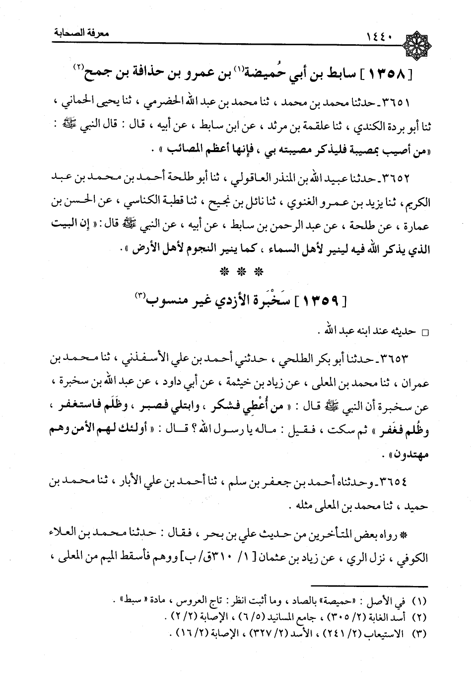 ٣٦٥٣ - حَدَّثَنَا أَبُو بَكْرٍ الطَّلْحِيُّ، حَدَّثَنِي أَحْمَدُ بْنُ عَلِيٍّ الْأَسْفَذْنِيُّ، ثنا مُحَمَّدُ بْنُ عِمْرَانَ، ثنا مُحَمَّدُ بْنُ الْمُعَلَّى، عَنْ زِيَادِ بْنِ خَيْثَمَةَ، عَنْ أَبِي دَاوُدَ، عَنْ عَبْدِ اللهِ بْنِ سَخْبَرَةَ، عَنْ سَخْبَرَةَ، أَنَّ النَّبِيَّ صَلَّى اللَّهُ عَلَيْهِ وَسَلَّمَ قَالَ: «مَنْ أُعْطِيَ فَشَكَرَ، وَابْتُلِيَ فَصَبَرَ، وَظَلَمَ فَاسْتَغْفَرَ، وَظُلِمَ فَغَفَرَ» ثُمَّ سَكَتَ، فَقِيلَ: مَا لَهُ يَا رَسُولَ اللهِ؟ قَالَ: «أُولَئِكَ لَهُمُ الْأَمْنُ وَهُمْ مُهْتَدُونَ»