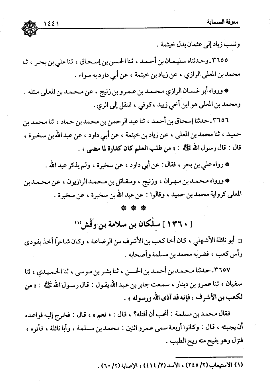 ٣٦٥٦ - حَدَّثَنَا إِسْحَاقُ بْنُ أَحْمَدَ، ثنا عَبْدُ الرَّحْمَنِ بْنُ مُحَمَّدِ بْنِ حَمَّادٍ، ثنا مُحَمَّدُ بْنُ حُمَيْدٍ، ثنا مُحَمَّدُ بْنُ الْمُعَلَّى، عَنْ زِيَادِ بْنِ خَيْثَمَةَ، عَنْ أَبِي دَاوُدَ، عَنْ عَبْدِ اللهِ بْنِ سَخْبَرَةَ، قَالَ: قَالَ رَسُولُ اللهِ صَلَّى اللَّهُ عَلَيْهِ وَسَلَّمَ: «مَنْ طَلَبَ الْعِلْمَ كَانَ كَفَّارَةً لِمَا مَضَى» رَوَاهُ عَلِيُّ بْنُ بَحْرٍ فَقَالَ: عَنْ أَبِي دَاوُدَ، عَنْ سَخْبَرَةَ، وَلَمْ يَذْكُرْ عَبْدَ اللهِ وَرَوَاهُ مُحَمَّدُ بْنُ مِهْرَانَ، وَزُنَيْجٌ، وَمُقَاتِلُ بْنُ مُحَمَّدٍ الرَّازِيُونَ، عَنْ مُحَمَّدِ بْنِ الْمُعَلَّى كَرِوَايَةِ مُحَمَّدِ بْنِ حُمَيْدٍ، وَقَالُوا: عَنْ عَبْدِ اللهِ بْنِ سَخْبَرَةَ، عَنْ سَخْبَرَةَ