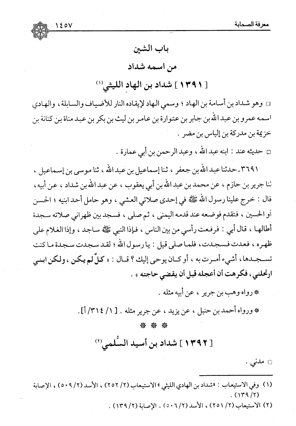 شَدَّادُ بْنُ الْهَادِ اللَّيْثِيُّ وَهُوَ شَدَّادُ بْنُ أُسَامَةَ بْنِ الْهَادِ، وَسُمِّيَ الْهَادِ لِإِيقَادِهِ النَّارَ لِلْأَضْيَافِ وَالسَّابِلَةِ، وَالْهَادِي اسْمُهُ عَمْرُو بْنُ عَبْدِ اللهِ بْنِ جَابِرِ بْنِ عِتْوَارَةَ بْنِ عَامِرِ بْنِ لَيْثِ بْنِ بَكْرِ بْنِ عَبْدِ مَنَاةَ بْنِ كِنَانَةَ بْنِ خُزَيْمَةَ بْنِ مُدْرِكَةَ بْنِ إِلْيَاسَ بْنِ مُضَرَ حَدِيثُهُ عِنْدَ ابْنِهِ عَبْدِ اللهِ، وَعَبْدِ الرَّحْمَنِ بْنِ أَبِي عُمَارَةَ