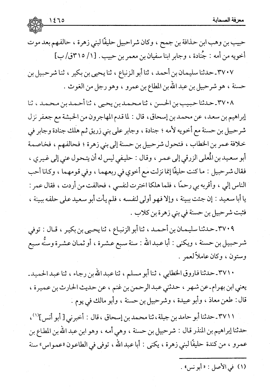 ٣٧١١ - حَدَّثَنَا أَبُو حَامِدِ بْنُ جَبَلَةَ، ثنا مُحَمَّدُ بْنُ إِسْحَاقَ، قَالَ: أَخْبَرَنِي أَبُو أَنَسٍ، حَدَّثَنَا إِبْرَاهِيمُ بْنُ الْمُنْذِرِ، قَالَ: " شُرَحْبِيلُ ابْنُ حَسَنَةَ، وَهِيَ أُمُّهُ، وَهُوَ ابْنُ عَبْدِ اللهِ بْنِ الْمُطَاعِ بْنِ عَمْرٍو، مِنْ كِنْدَةَ حَلِيفًا لِبَنِي زُهْرَةَ، يُكْنَى: أَبَا عَبْدِ اللهِ، تَوَفَّى فِي الطَّاعُونِ «عَمَوَاسَ» سَنَةَ ⦗١٤٦٦⦘ ثَمَانَ عَشْرَةَ، وَهُوَ ابْنُ سَبْعٍ وَسِتِّينَ "