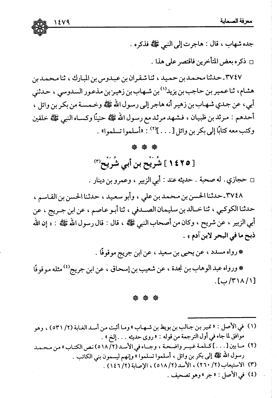 ٣٧٤٧ - حَدَّثَنَا مُحَمَّدُ بْنُ حُمَيْدٍ، ثنا شُقْرَانُ بْنُ عَبْدُوسِ بْنِ الْمُبَارَكِ، ثنا مُحَمَّدُ بْنُ هِشَامٍ، ثنا عُمَيْرُ بْنُ حَاجِبِ بْنِ يَزِيدَ بْنِ شِهَابِ بْنِ زُهَيْرِ بْنِ مَذْعُورٍ السَّدُوسِيُّ، حَدَّثَنِي أَبِي، عَنْ جَدِّي شِهَابِ بْنِ زُهَيْرٍ أَنَّهُ هَاجَرَ إِلَى رَسُولِ اللهِ صَلَّى اللَّهُ عَلَيْهِ وَسَلَّمَ وَخَمْسَةٌ مِنْ بَكْرِ بْنِ وَائِلٍ، أَحَدُهُمْ: مَرْثَدُ بْنُ ظَبْيَانَ، فَشَهِدَ مَرْثَدٌ مَعَ رَسُولِ اللهِ صَلَّى اللَّهُ عَلَيْهِ وَسَلَّمَ حُنَيْنًا وَكَسَاهُ النَّبِيُّ صَلَّى اللَّهُ عَلَيْهِ وَسَلَّمَ خَلْقَيْنِ وَكَتَبَ مَعَهُ كِتَابًا إِلَى بَكْرِ بْنِ وَائِلٍ. . . . «أَسْلِمُوا تَسْلَمُوا»