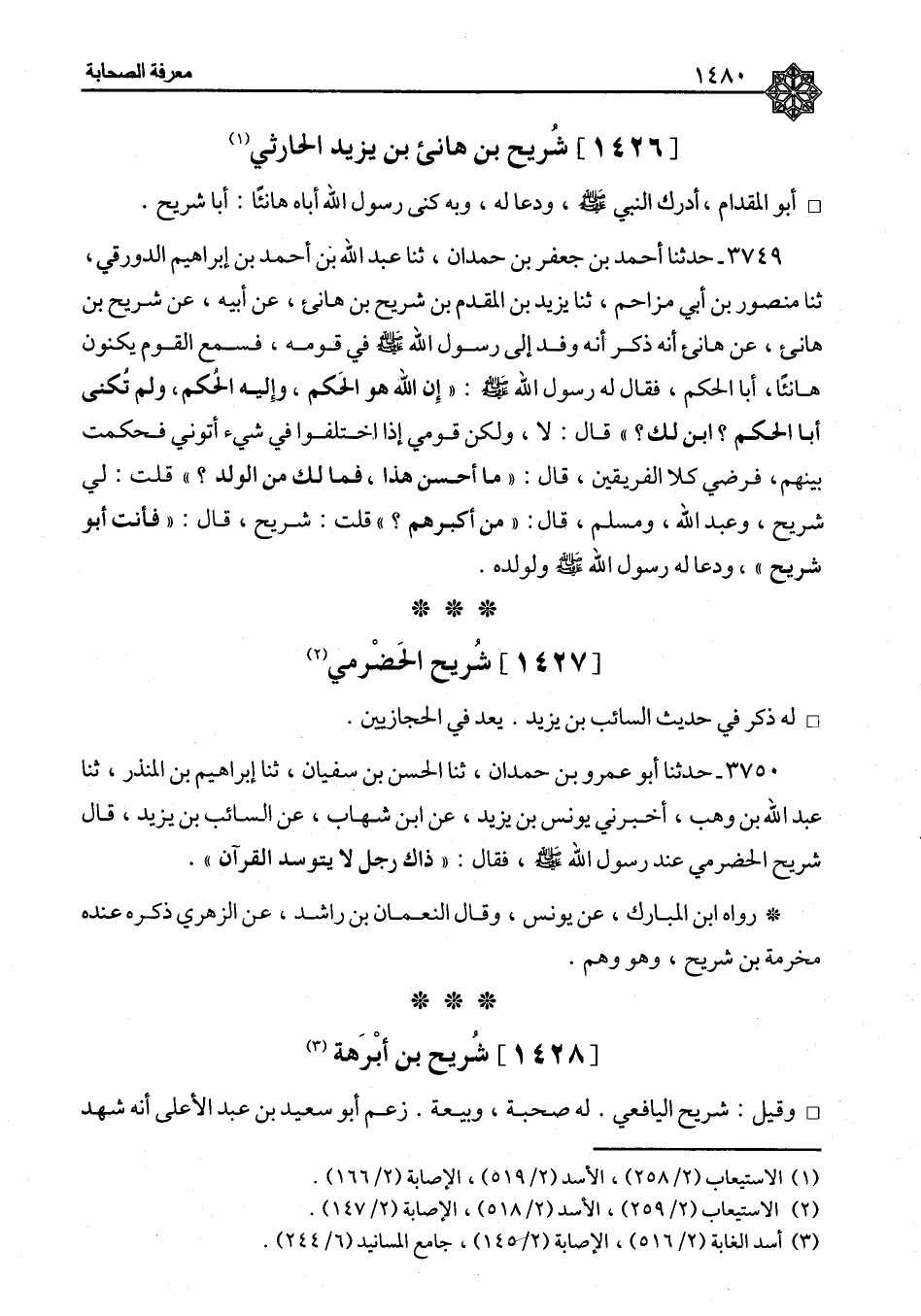 شُرَيْحُ بْنُ هَانِئِ بْنِ يَزِيدَ الْحَارِثِيُّ أَبُو الْمِقْدَامِ أَدْرَكَ النَّبِيَّ صَلَّى اللَّهُ عَلَيْهِ وَسَلَّمَ، وَدَعَا لَهُ وَبِهِ كَنَّى رَسُولُ اللهِ صَلَّى اللَّهُ عَلَيْهِ وَسَلَّمَ أَبَاهُ هَانِئًا: أَبُو شُرَيْحٍ