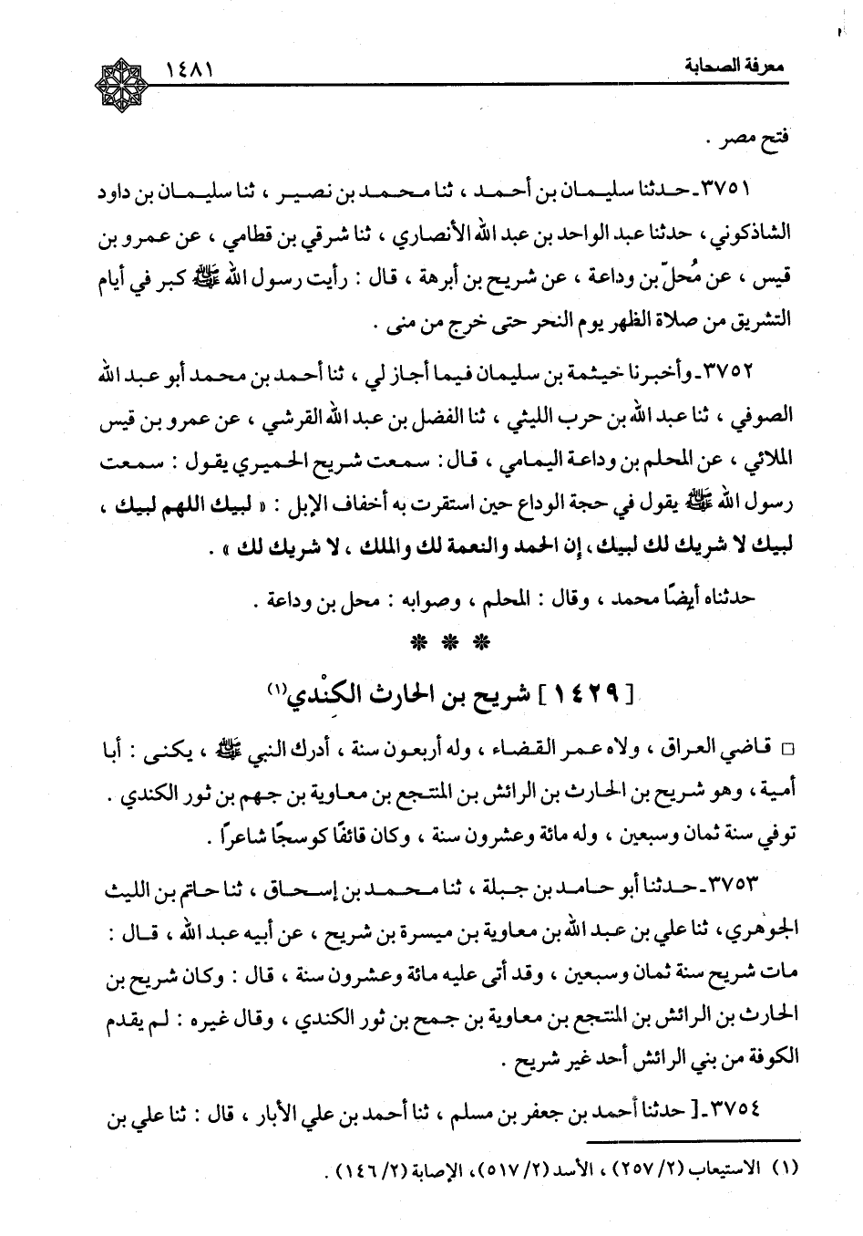 ٣٧٥٢ - وَأَخْبَرَنَا خَيْثَمَةُ بْنُ سُلَيْمَانَ، فِيمَا أَجَازَ لِي، ثنا أَحْمَدُ بْنُ مُحَمَّدٍ أَبُو عَبْدِ اللهِ الصُّوفِيُّ، ثنا عَبْدُ اللهِ بْنُ حَرْبٍ اللَّيْثِيُّ، ثنا الْفَضْلُ بْنُ عَبْدِ اللهِ الْقُرَشِيٌّ، عَنْ عَمْرِو بْنِ قَيْسٍ الْمُلَائِيِّ، عَنِ الْمُحْلِمِ بْنِ وَدَاعَةَ الْيَمَامِيِّ، قَالَ: سَمِعْتُ شُرَيْحًا الْحِمْيَرِيَّ، يَقُولُ: سَمِعْتُ رَسُولَ اللهِ صَلَّى اللَّهُ عَلَيْهِ وَسَلَّمَ يَقُولُ فِي حَجَّةِ الْوَدَاعِ حِينَ اسْتَقَرَّتْ بِهِ أَخْفَافُ الْإِبِلِ: «لَبَّيْكَ اللهُمَّ لَبَّيْكَ، لَبَّيْكَ لَا شَرِيكَ لَكَ لَبَّيْكَ، إِنَّ الْحَمْدَ وَالنِّعْمَةَ لَكَ وَالْمُلْكَ، لَا شَرِيكَ لَكَ» حَدَّثَنَاهُ أَيْضًا مُحَمَّدٌ، وَقَالَ: الْمُحْلِمُ، وَصَوَابُهُ: مُحِلُّ بْنُ وَدَاعَةَ