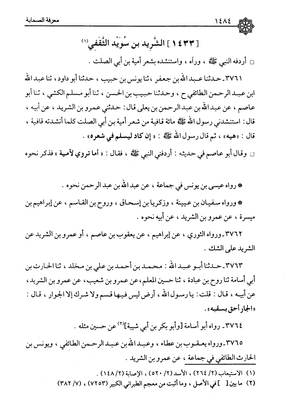 ٣٧٦١ - حَدَّثَنَا عَبْدُ اللهِ بْنُ جَعْفَرٍ، ثنا يُونُسُ بْنُ حَبِيبٍ، حَدَّثَنَا أَبُو دَاوُدَ، ثنا عَبْدُ اللهِ بْنُ عَبْدِ الرَّحْمَنِ الطَّائِفِيُّ، ح وَحَدَّثَنَا حَبِيبُ بْنُ الْحَسَنِ، ثنا أَبُو مُسْلِمٍ الْكَشَّيُّ، ثنا أَبُو عَاصِمٍ، عَنْ عَبْدِ اللهِ بْنِ عَبْدِ الرَّحْمَنِ بْنِ يَعْلَى، قَالَ: حَدَّثَنِي عَمْرُو بْنُ الشَّرِيدِ، عَنْ أَبِيهِ، قَالَ: اسْتَنْشَدَنِي رَسُولُ اللهِ صَلَّى اللَّهُ عَلَيْهِ وَسَلَّمَ مِائَةَ قَافِيَةٍ مِنْ شِعْرِ أُمَيَّةَ بْنِ أَبِي الصَّلْتِ كُلَّمَا أَنْشَدْتُهُ قَافِيَةً، قَالَ: «هِيهْ» ، ثُمَّ قَالَ رَسُولُ اللهِ صَلَّى اللَّهُ عَلَيْهِ وَسَلَّمَ: «إِنْ كَادَ لَيُسْلِمُ فِي شِعْرِهِ» وَقَالَ أَبُو عَاصِمٍ فِي حَدِيثِهِ: أَرْدَفَنِي النَّبِيُّ صَلَّى اللَّهُ عَلَيْهِ وَسَلَّمَ فَقَالَ: «أَمَا تَرْوِي لِأُمَيَّةَ» فَذَكَرَ نَحْوَهُ رَوَاهُ عِيسَى بْنُ يُونُسَ فِي جَمَاعَةٍ، عَنْ عَبْدِ اللهِ بْنِ عَبْدِ الرَّحْمَنِ نَحْوَهُ وَرَوَاهُ سُفْيَانُ بْنُ عُيَيْنَةَ، وَزَكَرِيَّا بْنِ إِسْحَاقَ، وَرَوْحُ بْنُ الْقَاسِمِ، عَنْ إِبْرَاهِيمَ بْنِ مَيْسَرَةَ، عَنْ عَمْرِو بْنِ الشَّرِيدِ، عَنْ أَبِيهِ نَحْوَهُ