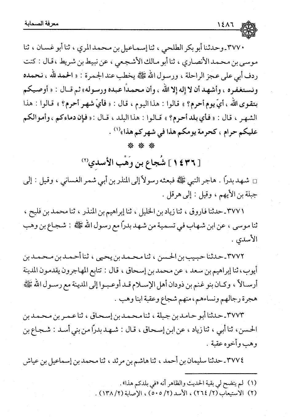 ٣٧٧١ - حَدَّثَنَا فَارُوقٌ، ثنا زِيَادُ بْنُ الْخَلِيلِ، ثنا إِبْرَاهِيمُ بْنُ الْمُنْذِرِ، ثنا مُحَمَّدُ بْنُ فُلَيْحٍ، ثنا مُوسَى، عَنِ ابْنِ شِهَابٍ، " فِي تَسْمِيَةِ مَنْ شَهِدَ بَدْرًا مَعَ رَسُولِ اللهِ صَلَّى اللَّهُ عَلَيْهِ وَسَلَّمَ: شُجَاعُ بْنُ وَهْبٍ الْأَسَدِيُّ "