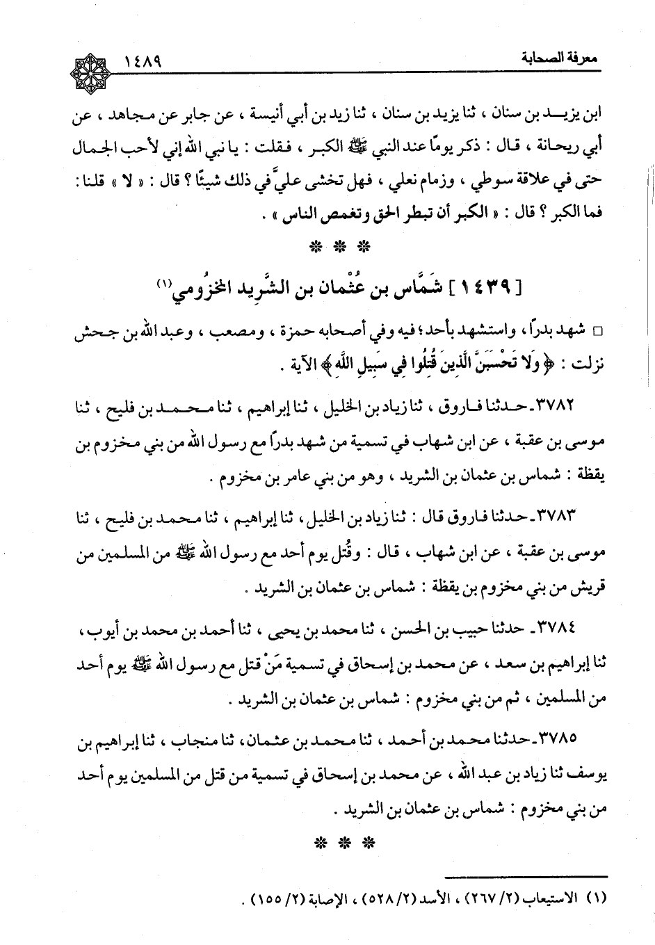 ٣٧٨٤ - حَدَّثَنَا حَبِيبُ بْنُ الْحَسَنِ، ثنا مُحَمَّدُ بْنُ يَحْيَى، ثنا أَحْمَدُ بْنُ مُحَمَّدِ بْنِ أَيُّوبَ، ثنا إِبْرَاهِيمُ بْنُ سَعْدٍ، عَنْ مُحَمَّدِ بْنِ إِسْحَاقَ، " فِي تَسْمِيَةِ مَنْ قُتِلَ مَعَ رَسُولِ اللهِ صَلَّى اللَّهُ عَلَيْهِ وَسَلَّمَ يَوْمَ أُحُدٍ مِنَ الْمُسْلِمِينَ، ثُمَّ مِنْ بَنِي مَخْزُومٍ: شَمَّاسُ بْنُ عُثْمَانَ بْنِ الشَّرِيدِ "
