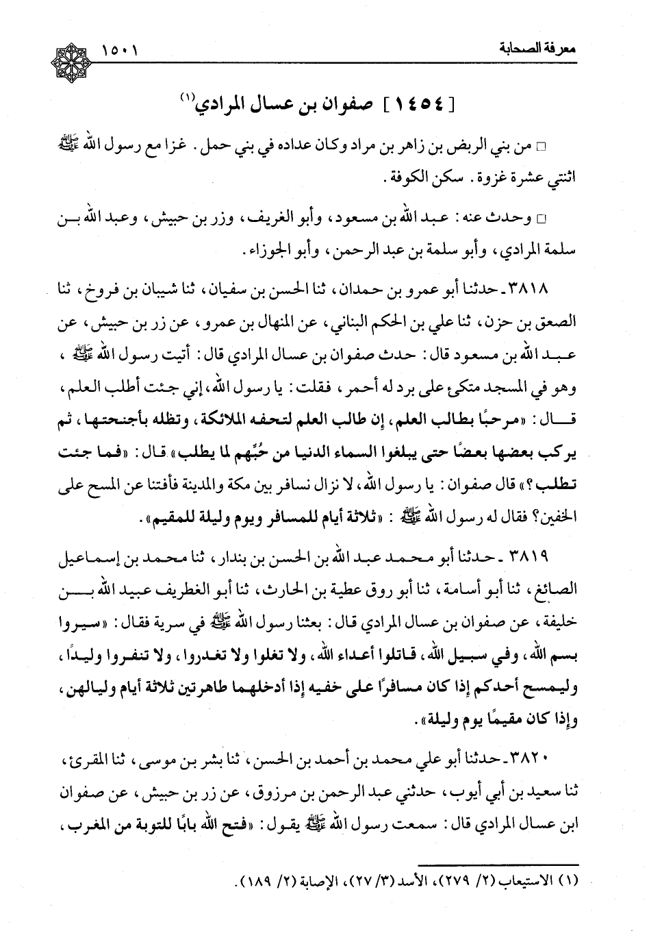 ٣٨١٨ - حَدَّثَنَا أَبُو عَمْرِو بْنُ حَمْدَانَ، ثنا الْحَسَنُ بْنُ سُفْيَانَ، ثنا شَيْبَانُ بْنُ فَرُّوخَ، ثنا الصَّعْقُ بْنُ حَزْنٍ، ثنا عَلِيُّ بْنُ الْحَكَمِ الْبُنَانِيُّ، عَنِ الْمِنْهَالِ بْنِ عَمْرٍو، عَنْ زِرِّ بْنِ حُبَيْشٍ، عَنْ عَبْدِ اللهِ بْنِ مَسْعُودٍ، قَالَ: حَدَّثَ صَفْوَانُ بْنُ عَسَّالٍ الْمُرَادِيُّ، قَالَ: أَتَيْتُ رَسُولَ اللهِ صَلَّى اللَّهُ عَلَيْهِ وَسَلَّمَ، وَهُوَ فِي الْمَسْجِدِ مُتَّكِئٌ عَلَى بُرْدٍ أَحْمَرَ، فَقُلْتُ: يَا رَسُولَ اللهِ، إِنِّي جِئْتُ أَطْلُبُ الْعِلْمَ قَالَ: «مَرْحَبًا بِطَالِبِ الْعِلْمِ، إِنَّ طَالِبَ الْعِلْمِ لَتَحُفُّهُ الْمَلَائِكَةُ، وَتُظِلُّهُ بِأَجْنِحَتِهَا، ثُمَّ يَرْكَبُ بَعْضُهَا بَعْضًا حَتَّى يَبْلُغُوا السَّمَاءَ الدُّنْيَا مِنْ حُبِّهِمْ لِمَا يَطْلُبُ» قَالَ: «فَمَا جِئْتُ تَطْلُبُ؟» قَالَ صَفْوَانُ: يَا رَسُولَ اللهِ، لَا نَزَالُ نُسَافِرُ بَيْنَ مَكَّةَ وَالْمَدِينَةِ فَأَفْتِنَا عَنِ الْمَسْحِ عَلَى الْخُفَّيْنِ؟ فَقَالَ لَهُ رَسُولُ اللهِ صَلَّى اللَّهُ عَلَيْهِ وَسَلَّمَ: «ثَلَاثَةُ أَيَّامٍ لِلْمُسَافِرِ وَيَوْمٌ وَلَيْلَةٌ لِلْمُقِيمِ»