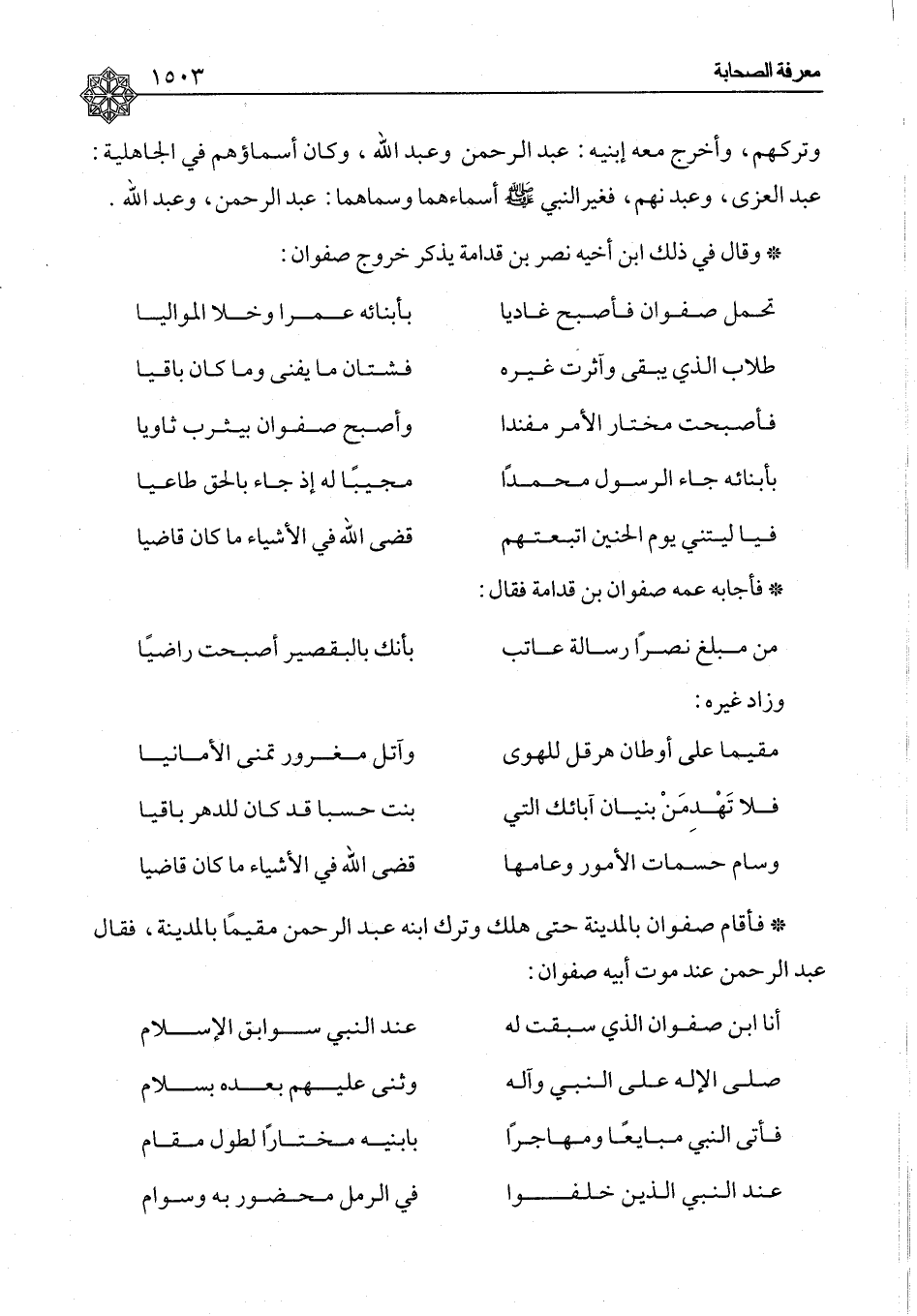 وَتَرَكَهُمْ، وَأَخْرَجَ مَعَهُ ابْنَيْهِ: عَبْدَ الرَّحْمَنِ وَعَبْدَ اللهِ، وَكَانَ أَسْمَاؤُهُمْ فِي الْجَاهِلِيَّةِ عَبْدَ الْعُزَّى، وَعَبْدَ نَهْمٍ، فَغَيَّرَ النَّبِيُّ صَلَّى اللَّهُ عَلَيْهِ وَسَلَّمَ أَسْمَاءَهُمَا وَسَمَّاهُمَا عَبْدَ الرَّحْمَنِ، وَعَبْدَ اللهِ وَقَالَ فِي ذَلِكَ ابْنُ أَخِيهِ نَصْرُ بْنُ قُدَامَةَ يَذْكُرُ خُرُوجَ صَفْوَانَ:
