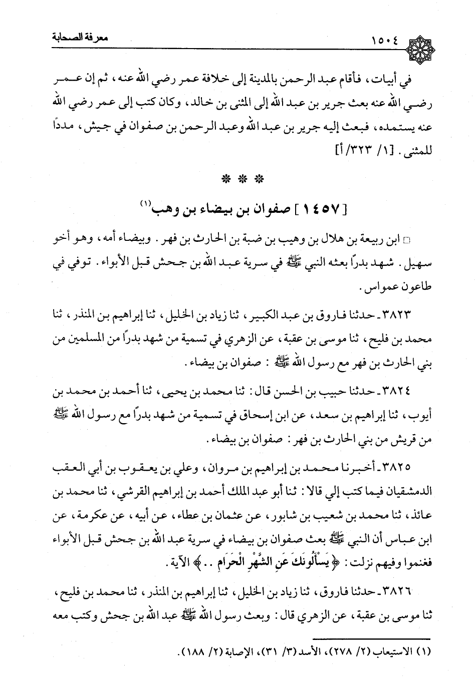 ٣٨٢٤ - حَدَّثَنَا حَبِيبُ بْنُ الْحَسَنِ، قَالَ: ثنا مُحَمَّدُ بْنُ يَحْيَى، ثنا أَحْمَدُ بْنُ مُحَمَّدِ بْنِ أَيُّوبَ، ثنا إِبْرَاهِيمُ بْنُ سَعْدٍ، عَنِ ابْنِ إِسْحَاقَ، " فِي تَسْمِيَةِ مَنْ شَهِدَ بَدْرًا مَعَ رَسُولِ اللهِ صَلَّى اللَّهُ عَلَيْهِ وَسَلَّمَ مِنْ قُرَيْشٍ مِنْ بَنِي الْحَارِثِ بْنِ فِهْرٍ: صَفْوَانُ ابْنُ بَيْضَاءَ "