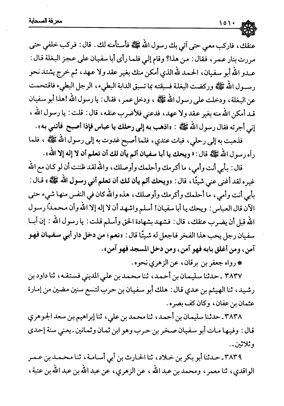 ٣٨٣٨ - حَدَّثَنَا سُلَيْمَانُ بْنُ أَحْمَدَ، ثنا مُحَمَّدُ بْنُ عَلِيٍّ، ثنا إِبْرَاهِيمُ بْنُ سَعْدٍ الْجَوْهَرِيُّ، قَالَ: «وَفِيهَا مَاتَ أَبُو سُفْيَانَ صَخْرُ بْنُ حَرْبٍ وَهُوَ ابْنُ ثَمَانٍ وَثَمَانِينَ، يَعْنِي سَنَةَ إِحْدَى وَثَلَاثِينَ»