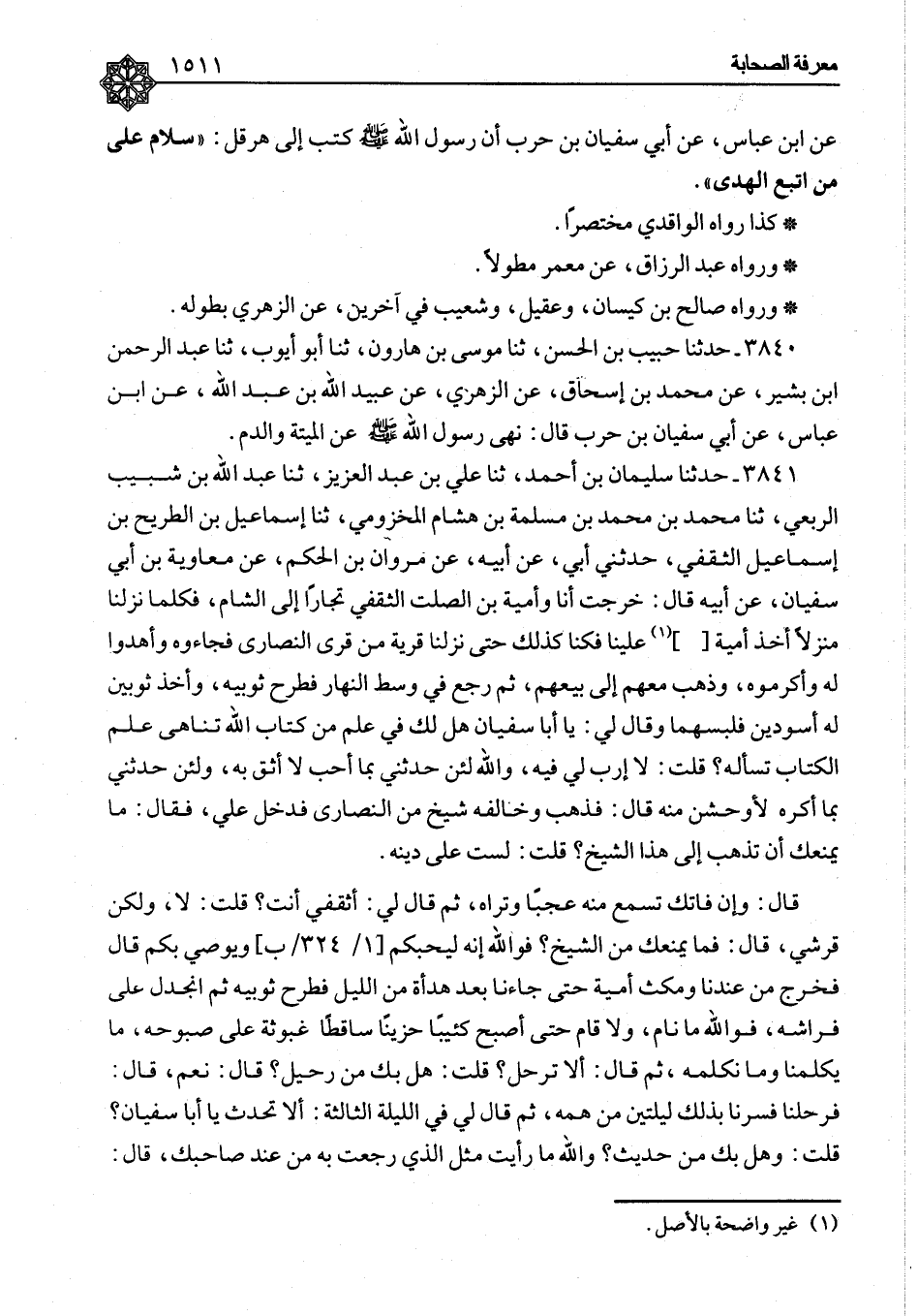 ٣٨٤١ - حَدَّثَنَا سُلَيْمَانُ بْنُ أَحْمَدَ، ثنا عَلِيُّ بْنُ عَبْدِ الْعَزِيزِ، ثنا عَبْدُ اللهِ بْنُ شَبِيبٍ الرَّبْعِيُّ، ثنا مُحَمَّدُ بْنُ مُحَمَّدِ بْنِ مَسْلَمَةَ بْنِ هِشَامٍ الْمَخْزُومِيُّ، ثنا إِسْمَاعِيلُ بْنُ الطَّرِيحِ بْنِ إِسْمَاعِيلَ الثَّقَفِيُّ، حَدَّثَنِي أَبِي، عَنْ أَبِيهِ، عَنْ مَرْوَانَ بْنِ الْحَكَمِ، عَنْ مُعَاوِيَةَ بْنِ أَبِي سُفْيَانَ، عَنْ أَبِيهِ، قَالَ: خَرَجْتُ أَنَا وَأُمَيَّةُ بْنُ أَبِي الصَّلْتِ الثَّقَفِيُّ، تُجَّارًا إِلَى الشَّامِ، فَكُلَّمَا نَزَلْنَا مَنْزِلًا أَخَذَ أُمَيَّةُ. . . . عَلَيْنَا فَكُنَّا كَذَلِكَ حَتَّى نَزَلْنَا قَرْيَةً مِنْ قُرَى النَّصَارَى فَجَاءُوهُ وَأَهْدُوا لَهُ وَأَكْرَمُوهُ، وَذَهَبَ مَعَهُمْ إِلَى بِيَعِهِمْ، ثُمَّ رَجَعَ فِي وَسَطِ النَّهَارِ فَطَرَحَ ثَوْبَيْهِ، وَأَخَذَ ثَوْبَيْنِ لَهُ أَسْوَدَيْنِ فَلَبِسَهُمَا وَقَالَ لِي: يَا أَبَا سُفْيَانَ هَلْ لَكَ فِي عِلْمٍ مِنْ كِتَابِ اللهِ تَنَاهَى عِلْمَ الْكِتَابِ تَسْأَلُهُ؟ قُلْتُ: لَا إِرْبَ لِي فِيهِ، وَاللهِ لَئِنْ حَدَّثَنِي بِمَا أُحِبُّ لَا أَثِقُ بِهِ، وَلَئِنْ حَدَّثَنِي بِمَا أَكْرَهُ لَأَوْحَشَنَّ مِنْهُ قَالَ: فَذَهَبَ وَخَالَفَهُ شَيْخٌ مِنَ النَّصَارَى فَدَخَلَ عَلَيَّ فَقَالَ: مَا يَمْنَعُكَ أَنْ تَذْهَبَ إِلَى هَذَا الشَّيْخِ؟ قُلْتُ: لَسْتُ عَلَى دِينِهِ، قَالَ: وَإِنْ فَاتَكَ تَسْمَعُ مِنْهُ عَجَبًا وَتَرَاهُ، ثُمَّ قَالَ لِي: أَثَقَفِيٌّ أَنْتَ؟ قُلْتُ: لَا، وَلَكِنْ قُرَشِيٌّ قَالَ: فَمَا يَمْنَعُكَ مِنَ الشَّيْخِ؟ فَوَاللهِ إِنَّهُ لَيُحِبُّكُمْ وَيُوصِي بِكُمْ قَالَ: فَخَرَجَ مِنْ عِنْدَنَا وَمَكَثَ أُمَيَّةُ حَتَّى جَاءَنَا بَعْدَ هَدْأَةٍ مِنَ اللَّيْلِ فَطَرَحَ ثَوْبَيْهِ ثُمَّ انْجَدَلَ عَلَى فِرَاشِهِ، فَوَاللهِ مَا نَامَ، وَلَا قَامَ حَتَّى أَصْبَحَ كَئِيبًا حَزِينًا سَاقِطًا غَبُوثَةً عَلَى صَبُوحِهِ، مَا يُكَلِّمُنَا وَمَا نُكَلِّمَهُ، ثُمَّ قَالَ: أَلَا تَرْحَلُ؟ قُلْتُ: هَلْ بِكَ مِنْ رَحِيلٍ؟ قَالَ: نَعَمْ قَالَ: فَرَحَلْنَا فَسِرْنَا بِذَلِكَ لَيْلَتَيْنِ مِنْ هَمِّهِ، ثُمَّ قَالَ لِي فِي اللَّيْلَةِ الثَّالِثَةِ: أَلَا تَحَدَّثُ يَا أَبَا سُفْيَانَ؟ قُلْتُ: وَهَلْ بِكَ مِنْ حَدِيثٍ؟ وَاللهِ مَا رَأَيْتُ مِثْلَ الَّذِي رَجَعْتَ بِهِ مِنْ عِنْدِ صَاحِبِكَ قَالَ: ⦗١٥١٢⦘ أَمَا إِنَّ ذَلِكَ لِشَيْءٌ لَسْتُ فِيهِ، إِنَّمَا ذَلِكَ شَيْءٌ وَجِلْتُ بِهِ مِنْ مُنْقَلَبِي قَالَ: قُلْتُ: وَهَلْ لَكَ مِنْ مُنْقَلَبٍ؟ قَالَ: إِنِّي وَاللهِ لَأَمُوتَنَّ ثُمَّ لَأُحْيَيَنَّ قَالَ: قُلْتُ: هَلْ أَنْتَ قَائِلٌ أَمَاتَنِي؟ قَالَ: عَلَى مَاذَا؟ قُلْتُ: عَلَى أَنَّكَ لَا تُبْعَثُ وَلَا تُحَاسَبُ قَالَ: فَضَحِكَ ثُمَّ قَالَ: بَلْ وَاللهِ يَا أَبَا سُفْيَانَ لَنُبْعَثَنَّ ثُمَّ لَنُحَاسَبَنَّ، وَلَيَدْخُلَنَّ فَرِيقٌ الْجَنَّةَ، وَفَرِيقٌ النَّارَ، قُلْتُ: فَفِي أَيِّهِمَا أَنْتَ أَخْبَرَكَ صَاحِبُكَ؟ قَالَ: لَا عِلْمَ لِصَاحِبِي بِذَلِكَ فِي وَلَا فِي نَفْسِهِ قَالَ: فَكُنَّا فِي ذَلِكَ لَيْلَتَيْنِ يَعْجَبُ مِنِّي، وَأَضْحَكُ مِنْهُ حَتَّى قَدِمْنَا غَوْطَةَ دِمَشْقَ، فَبِعْنَا مَتَاعَنَا، فَأَقَمْنَا بِهَا شَهْرَيْنِ، فَارْتَحَلْنَا حَتَّى نَزَلْنَا قَرْيَةً مِنْ قُرَى النَّصَارَى، فَلَمَّا رَأَوْهُ جَاءُوهُ، وَأَهْدُوا لَهُ، وَذَهَبَ مَعَهُمْ إِلَى بَيْعَتِهِمْ حَتَّى جَاءَ بَعْدَ مَا انْتَصَفَ النَّهَارُ، فَلَبِسَ ثَوْبَيْهِ وَرَمَى بِنَفْسِهِ عَلَى فِرَاشِهِ فَوَاللهِ، مَا نَامَ وَلَا قَامَ، وَأَصْبَحَ حَزِينًا كَئِيبًا، لَا يُكَلِّمُنَا وَلَا نُكَلِّمُهُ، ثُمَّ قَالَ: أَلَا تَرْحَلُ؟ قُلْتُ: بَلَى، إِنْ شِئْتَ فَرُحْنَا ك