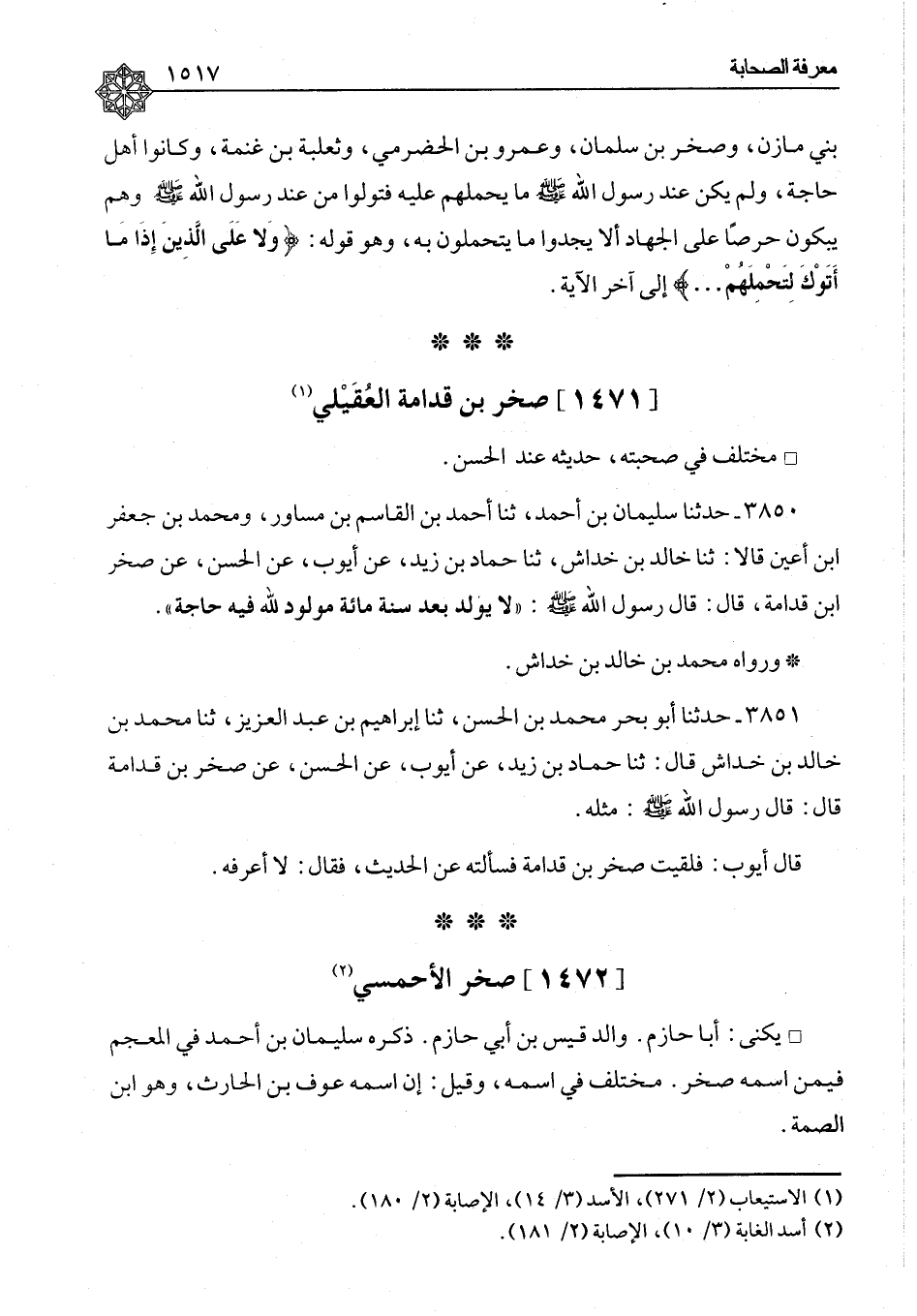٣٨٥٠ - حَدَّثَنَا سُلَيْمَانُ بْنُ أَحْمَدَ، ثنا أَحْمَدُ بْنُ الْقَاسِمِ بْنِ مُسَاوِرٍ، وَمُحَمَّدُ بْنُ جَعْفَرِ بْنِ أَعْيَنَ، قَالَا: ثنا خَالِدُ بْنُ خِدَاشٍ، ثنا حَمَّادُ بْنُ زَيْدٍ، عَنْ أَيُّوبَ، عَنِ الْحَسَنِ، عَنْ صَخْرِ بْنِ قُدَامَةَ، قَالَ: قَالَ رَسُولُ اللهِ صَلَّى اللَّهُ عَلَيْهِ وَسَلَّمَ: «لَا يُولَدُ بَعْدَ سَنَةِ مِائَةٍ مَوْلُودٌ لِلَّهِ فِيهِ حَاجَةٌ» . وَرَوَاهُ مُحَمَّدُ بْنُ خَالِدِ بْنِ خِدَاشٍ