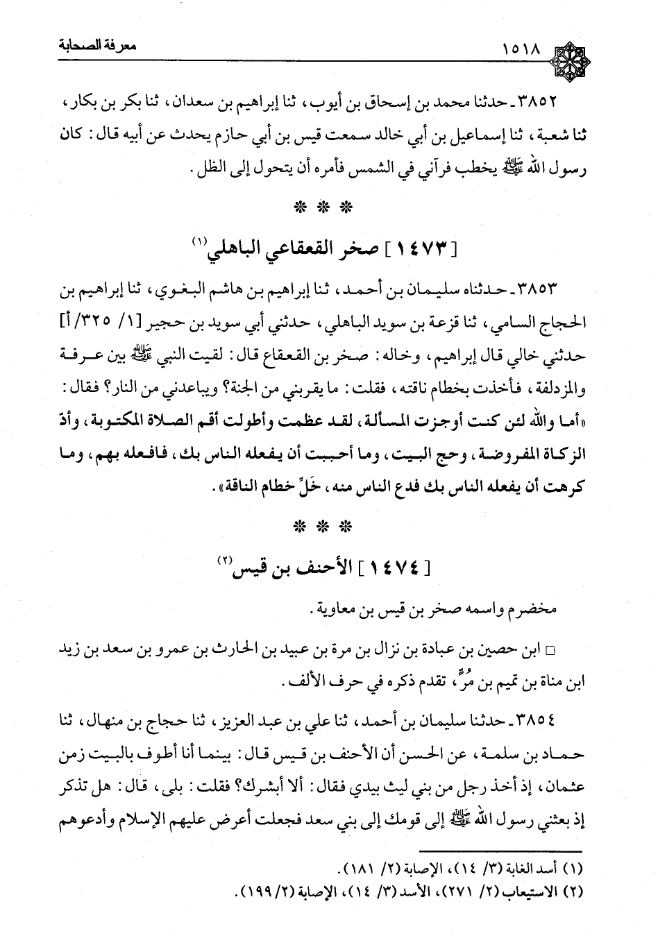 ٣٨٥٤ - حَدَّثَنَا سُلَيْمَانُ بْنُ أَحْمَدَ، ثنا عَلِيُّ بْنُ عَبْدِ الْعَزِيزِ، ثنا حَجَّاجُ بْنُ مِنْهَالٍ، ثنا حَمَّادُ بْنُ سَلَمَةَ، عَنِ الْحَسَنِ، أَنَّ الْأَحْنَفَ بْنَ قَيْسٍ، قَالَ: بَيْنَمَا أَنَا أَطُوفُ بِالْبَيْتِ زَمَنَ عُثْمَانَ إِذْ أَخَذَ رَجُلٌ مِنْ بَنِي لَيْثٍ بِيَدِي فَقَالَ: أَلَا أُبَشِّرُكَ؟ فَقُلْتُ: بَلَى قَالَ: هَلْ تَذْكُرُ إِذْ بَعَثَنِي رَسُولُ اللهِ صَلَّى اللَّهُ عَلَيْهِ وَسَلَّمَ إِلَى قَوْمِكَ إِلَى بَنِي سَعْدٍ فَجَعَلْتُ أَعْرِضُ عَلَيْهِمُ الْإِسْلَامَ وَأَدْعُوهُمْ ⦗١٥١٩⦘ إِلَيْهِ، فَقُلْتَ أَنْتَ: إِنَّهُ يَدْعُو إِلَى الْخَيْرِ وَيَأْمُرُ بِهِ، إِنَّهُ لَيَدْعُو إِلَى الْخَيْرِ وَيَأْمُرُ بِهِ، فَبَلَّغْتُ ذَلِكَ النَّبِيَّ صَلَّى اللَّهُ عَلَيْهِ وَسَلَّمَ فَقَالَ: «اللهُمَّ اغْفِرْ لِلْأَحْنَفِ» يَقُولُ: مَا مِنْ عَمَلِي شَيْءٌ أَرْجَى لِي مِنْهُ