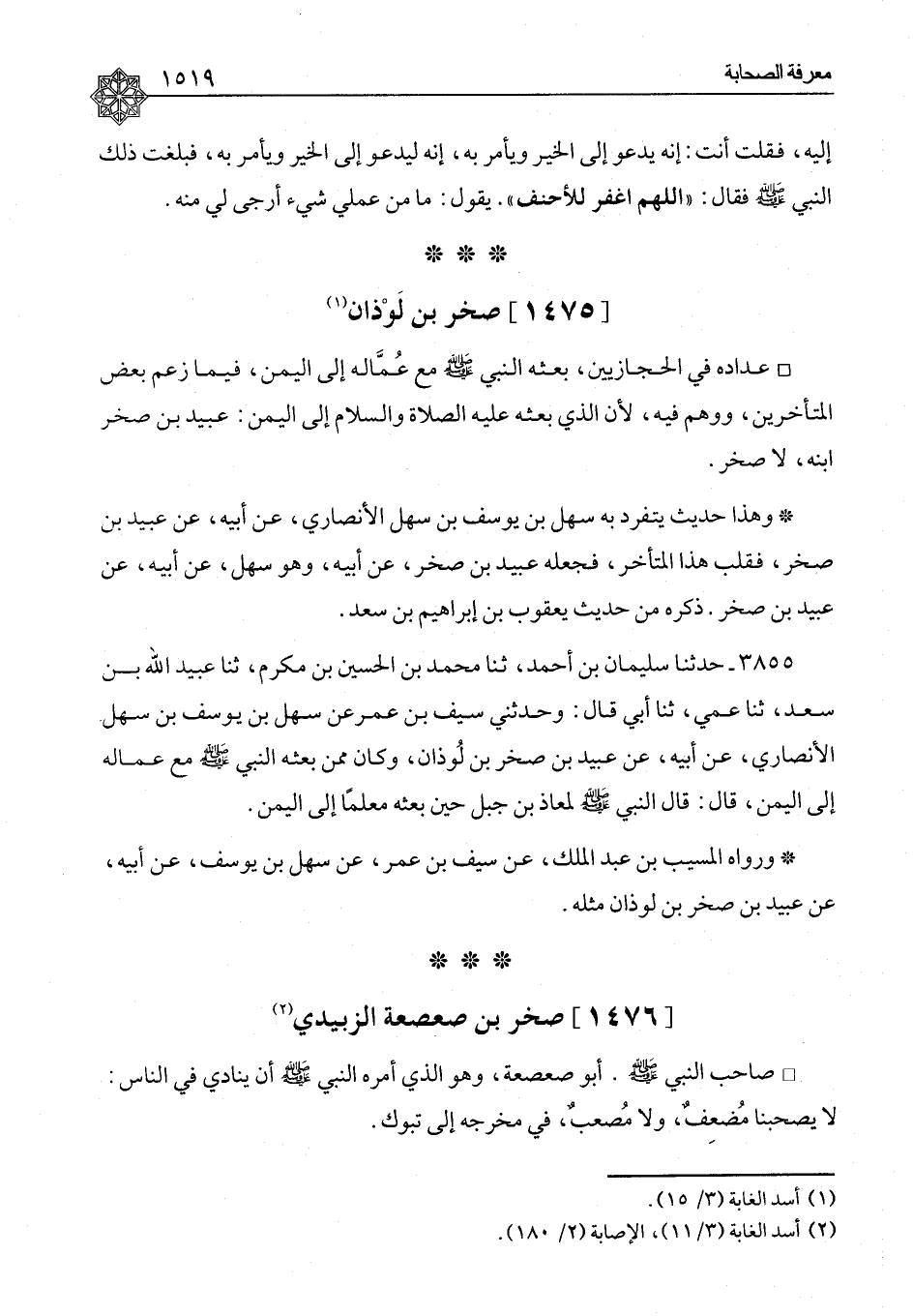 صَخْرُ بْنُ لَوْذَانَ عِدَادُهُ فِي الْحِجَازِيِّينَ، بَعَثَهُ النَّبِيُّ صَلَّى اللَّهُ عَلَيْهِ وَسَلَّمَ مَعَ عُمَّالِهِ إِلَى الْيَمَنِ، فِيمَا زَعَمَ بَعْضُ الْمُتَأَخِّرِينَ، وَوَهِمَ فِيهِ، لِأَنَّ الَّذِي بَعَثَهُ عَلَيْهِ الصَّلَاةُ وَالسَّلَامُ إِلَى الْيَمَنِ: عُبَيْدُ بْنُ صَخْرٍ ابْنُهُ، لَا صَخْرٌ وَهَذَا حَدِيثٌ يَتَفَرَّدُ بِهِ سَهْلُ بْنُ يُوسُفَ بْنِ سَهْلٍ الْأَنْصَارِيُّ عَنْ أَبِيهِ عَنْ عُبَيْدِ بْنِ صَخْرٍ، فَقَلَبَ هَذَا الْمُتَأَخِّرُ فَجَعَلَهُ عُبَيْدَ بْنَ صَخْرٍ عَنْ أَبِيهِ، وَهُوَ سَهْلٌ عَنْ أَبِيهِ عَنْ عُبَيْدِ بْنِ صَخْرٍ ذَكَرَهُ مِنْ حَدِيثِ يَعْقُوبَ بْنِ إِبْرَاهِيمَ بْنِ سَعْدٍ