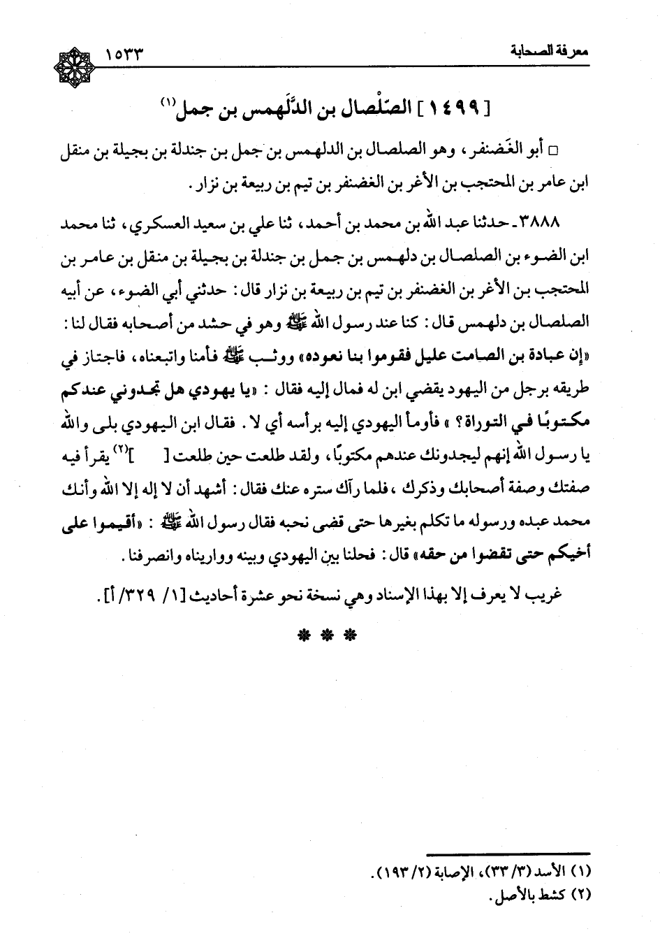 ٣٨٨٨ - حَدَّثَنَا عَبْدُ اللهِ بْنُ مُحَمَّدِ بْنِ أَحْمَدَ، ثنا عَلِيُّ بْنُ سَعِيدٍ الْعَسْكَرِيُّ، ثنا مُحَمَّدُ بْنُ الضَّوْءِ بْنِ الصَّلْصَالِ بْنِ دَلَهْمَسِ بْنِ جَمَلِ بْنِ جَنْدَلَةَ بْنِ بَجِيلَةَ بْنِ مُنْقِلِ بْنِ عَامِرِ بْنِ الْمُحْتَجَبِ بْنِ الْأَغَرِّ بْنِ الْغَضَنْفَرِ بْنِ تَيْمِ بْنِ رَبِيعَةَ بْنِ نِزَارٍ، قَالَ: حَدَّثَنِي أَبِي الضَّوْءُ، عَنْ أَبِيهِ الصَّلْصَالِ بْنِ دَلَهْمَسٍ، قَالَ: كُنَّا عِنْدَ رَسُولِ اللهِ صَلَّى اللَّهُ عَلَيْهِ وَسَلَّمَ وَهُوَ فِي حَشْدٍ مِنْ أَصْحَابِهِ فَقَالَ لَنَا: «إِنَّ عُبَادَةَ بْنَ الصَّامِتِ عَلِيلٌ فَقُومُوا بِنَا نَعُودُهُ» وَوَثَبَ صَلَّى اللَّهُ عَلَيْهِ وَسَلَّمَ فَأَمَّنَا وَاتَّبَعْنَاهُ، فَاجْتَازَ فِي طَرِيقِهِ بِرَجُلٍ مِنَ الْيَهُودِ يَقْضِي ابْنٌ لَهُ فَمَالَ إِلَيْهِ فَقَالَ: «يَا يَهُودِيُّ هَلْ تَجِدُونِي عِنْدَكُمْ مَكْتُوبًا فِي التَّوْرَاةِ؟» فَأَوْمَأَ الْيَهُودِيُّ إِلَيْهِ بِرَأْسِهِ أَيْ لَا، فَقَالَ ابْنُ الْيَهُودِيِّ بَلَى وَاللهِ يَا رَسُولَ اللهِ إِنَّهُمْ لَيَجِدُونَكَ عِنْدَهُمْ مَكْتُوبًا، وَلَقَدْ طَلَعْتُ حِينَ طَلَعْتُ يُقْرَأُ فِيهِ صِفَتُكَ وَصِفَةُ أَصْحَابِكَ وَذِكْرُكَ، فَلَمَّا رَآكَ سَتَرَهُ عَنْكَ فَقَالَ: أَشْهَدُ أَنْ لَا إِلَهَ إِلَّا اللهُ وَأَنَّكَ مُحَمَّدٌ عَبْدُهُ وَرَسُولُهُ مَا تَكَلَّمَ بِغَيْرِهَا حَتَّى قَضَى نَحْبَهُ فَقَالَ رَسُولُ اللهِ صَلَّى اللَّهُ عَلَيْهِ وَسَلَّمَ: «أَقِيمُوا عَلَى أَخِيكُمْ حَتَّى تَقْضُوا مِنْ حَقِّهِ» قَالَ: فَحِلْنَا بَيْنَ الْيَهُودِيِّ وَبَيْنَهُ، وَوَارَيْنَاهُ وَانْصَرَفْنَا غَرِيبٌ لَا يُعْرَفُ إِلَّا بِهَذَا الْإِسْنَادِ وَهِيَ نُسْخَةٌ نَحْوُ عَشْرَةِ أَحَادِيثَ