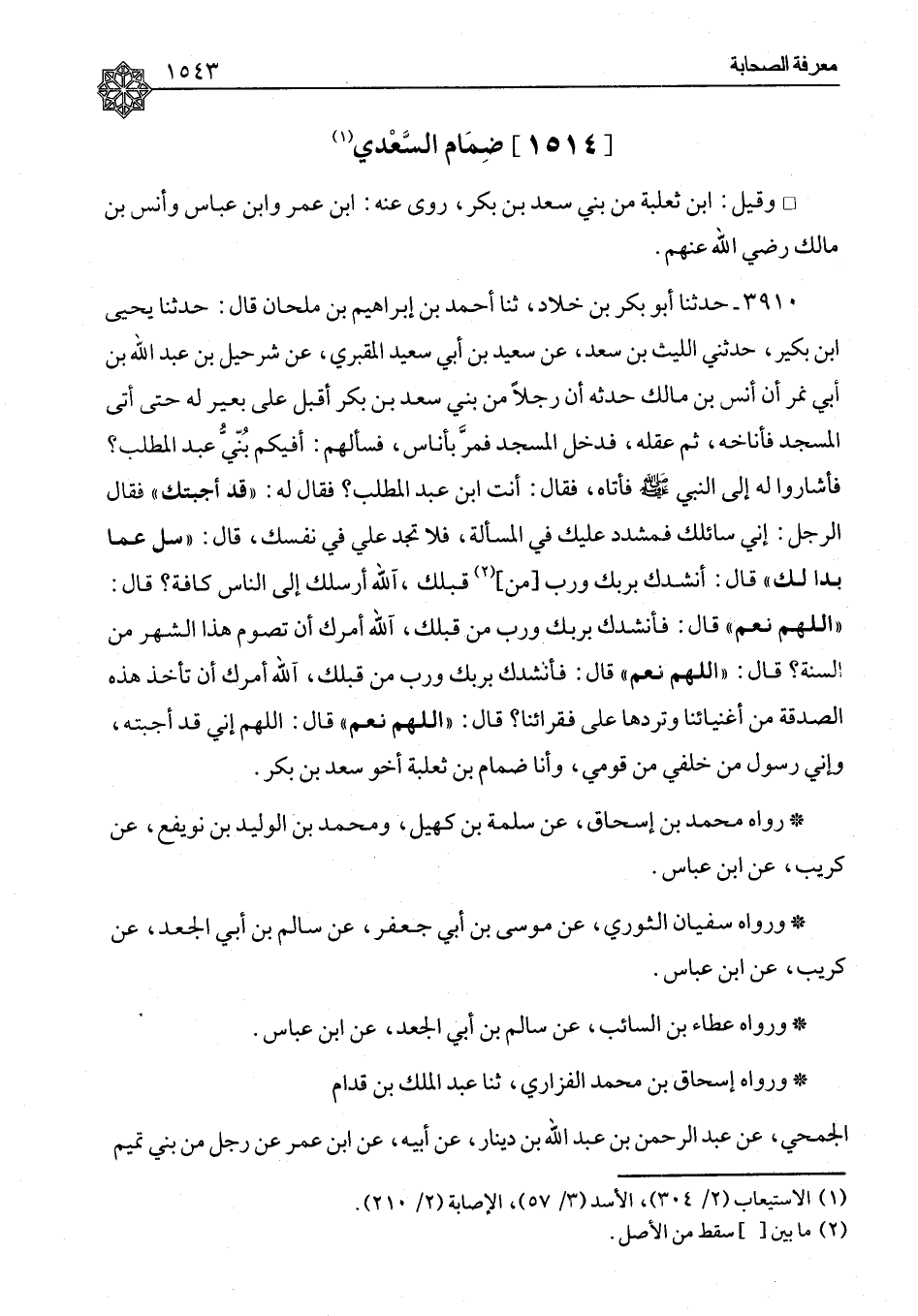 ضِمَامٌ السَّعْدِيُّ وَقِيلَ: ابْنُ ثَعْلَبَةَ مِنْ بَنِي سَعْدِ بْنِ بَكْرٍ رَوَى عَنْهُ: ابْنُ عُمَرَ وَابْنُ عَبَّاسٍ وَأَنَسُ بْنُ مَالِكٍ رَضِيَ اللهُ عَنْهُمْ