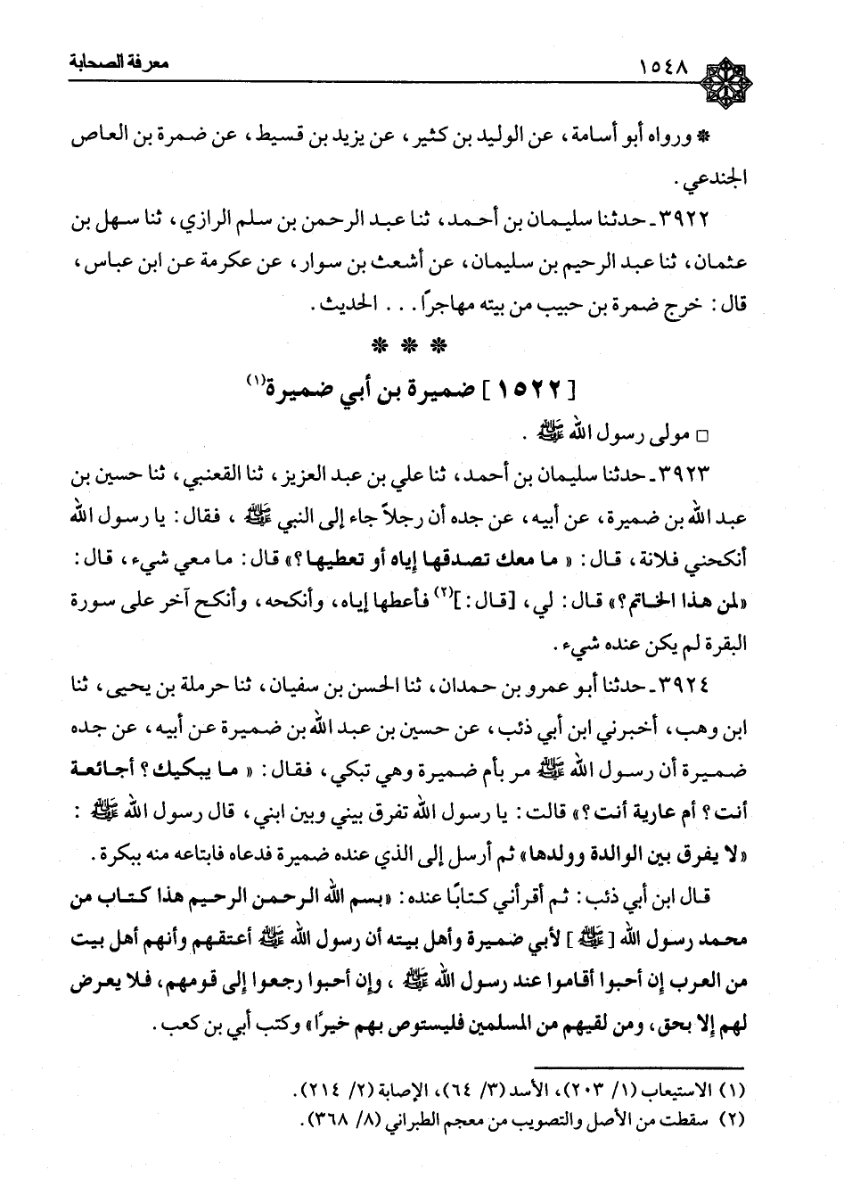 ٣٩٢٤ - حَدَّثَنَا أَبُو عَمْرِو بْنُ حَمْدَانَ، ثنا الْحَسَنُ بْنُ سُفْيَانَ، ثنا حَرْمَلَةُ بْنُ يَحْيَى، ثنا ابْنُ وَهْبٍ، أَخْبَرَنِي ابْنُ أَبِي ذِئْبٍ، عَنْ حُسَيْنِ بْنِ عَبْدِ اللهِ بْنِ ضُمَيْرَةَ، عَنْ أَبِيهِ، عَنْ جَدِّهِ ضُمَيْرَةَ أَنَّ رَسُولَ اللهِ صَلَّى اللَّهُ عَلَيْهِ وَسَلَّمَ مَرَّ بِأُمِّ ضُمَيْرَةَ وَهِيَ تَبْكِي فَقَالَ: «مَا يُبْكِيكِ؟ أَجَائِعَةٌ أَنْتِ؟ أَمْ عَارِيَةٌ أَنْتِ؟» قَالَتْ: يَا رَسُولَ اللهِ تَفَرَّقَ بَيْنِي وَبَيْنَ ابْنِي قَالَ رَسُولُ اللهِ صَلَّى اللَّهُ عَلَيْهِ وَسَلَّمَ: «لَا يُفَرَّقُ بَيْنَ الْوَالِدَةِ وَوَلَدِهَا» ثُمَّ أَرْسَلَ إِلَى الَّذِي عِنْدَهُ ضُمَيْرَةُ فَدَعَاهُ فَابْتَاعَهُ مِنْهُ بِبَكَرَةٍ، قَالَ ابْنُ أَبِي ذِئْبٍ: ثُمَّ أَقْرَأَنِي كِتَابًا عِنْدَهُ: «بِسْمِ اللهِ الرَّحْمَنِ الرَّحِيمِ هَذَا كِتَابٌ مِنْ مُحَمَّدٍ رَسُولِ اللهِ صَلَّى اللَّهُ عَلَيْهِ وَسَلَّمَ لِأَبِي ضُمَيْرَةَ وَأَهْلِ بَيْتِهِ أَنَّ رَسُولَ اللهِ صَلَّى اللَّهُ عَلَيْهِ وَسَلَّمَ أَعْتَقَهُمْ وَأَنَّهُمْ أَهْلُ بَيْتٍ مِنَ الْعَرَبِ إِنْ أَحَبُّوا أَقَامُوا عِنْدَ رَسُولِ اللهِ صَلَّى اللَّهُ عَلَيْهِ وَسَلَّمَ، وَإِنْ أَحَبُّوا رَجَعُوا إِلَى قَوْمِهِمْ، فَلَا يَعْرِضُ لَهُمْ إِلَّا بِالْحَقِّ، وَمَنْ لَقِيَهُمْ مِنَ الْمُسْلِمِينَ فَلْيَسْتَوْصِ بِهِمْ خَيْرًا» وَكَتَبَ أُبَيُّ بْنُ كَعْبٍ ⦗١٥٤٩⦘ رَوَاهُ زَيْدُ بْنُ الْحُبَابِ، عَنْ حُسَيْنٍ نَحْوَهُ