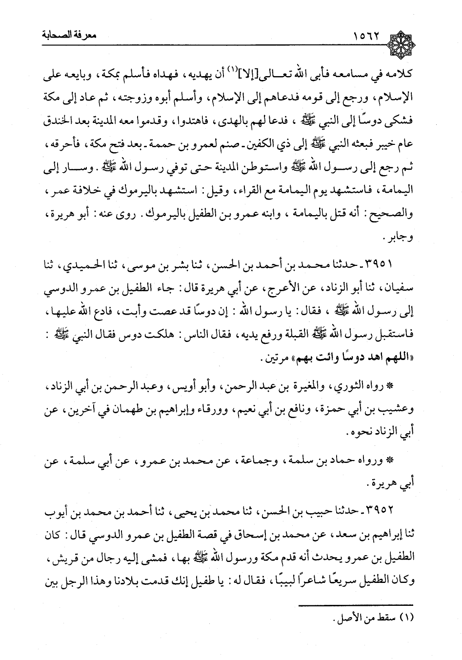 ٣٩٥١ - حَدَّثَنَا مُحَمَّدُ بْنُ أَحْمَدَ بْنِ الْحَسَنِ، ثنا بِشْرُ بْنُ مُوسَى، ثنا الْحُمَيْدِيُّ، ثنا سُفْيَانُ، ثنا أَبُو الزِّنَادِ، عَنِ الْأَعْرَجِ، عَنْ أَبِي هُرَيْرَةَ، قَالَ: جَاءَ الطُّفَيْلُ بْنُ عَمْرٍو الدَّوْسِيُّ إِلَى رَسُولِ اللهِ صَلَّى اللَّهُ عَلَيْهِ وَسَلَّمَ فَقَالَ: يَا رَسُولَ اللهِ: إِنَّ دَوْسًا قَدْ عَصَتْ وَأَبَتْ، فَادْعُ اللهَ عَلَيْهَا، فَاسْتَقْبَلَ رَسُولُ اللهِ صَلَّى اللَّهُ عَلَيْهِ وَسَلَّمَ الْقِبْلَةَ وَرَفَعَ يَدَيْهِ فَقَالَ النَّاسُ: هَلَكَتْ دَوْسٌ فَقَالَ النَّبِيُّ صَلَّى اللَّهُ عَلَيْهِ وَسَلَّمَ: «اللهُمَّ اهْدِ دَوْسًا وَائْتِ بِهِمْ» مَرَّتَيْنِ رَوَاهُ الثَّوْرِيُّ، وَالْمُغِيرَةُ بْنُ عَبْدِ الرَّحْمَنِ، وَأَبُو أُوَيْسٍ، وَعَبْدُ الرَّحْمَنِ بْنُ أَبِي الزِّنَادِ، وَعُشَيْبُ بْنُ أَبِي حَمْزَةَ، وَنَافِعُ بْنُ أَبِي نُعَيْمٍ، وَوَرْقَاءُ وَإِبْرَاهِيمُ بْنُ طَهْمَانَ فِي آخَرِينَ، عَنْ أَبِي الزِّنَادِ نَحْوَهُ، وَرَوَاهُ حَمَّادُ بْنُ سَلَمَةَ وَجَمَاعَةٌ، عَنْ مُحَمَّدِ بْنِ عَمْرٍو، عَنْ أَبِي سَلَمَةَ، عَنْ أَبِي هُرَيْرَةَ