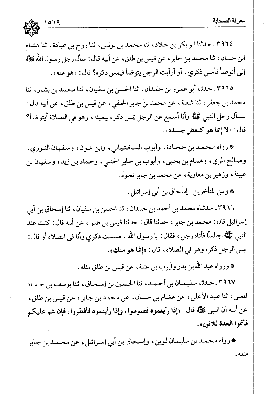 ٣٩٦٥ - حَدَّثَنَا أَبُو عَمْرِو بْنُ حَمْدَانَ، ثنا الْحَسَنُ بْنُ سُفْيَانَ، ثنا مُحَمَّدُ بْنُ بَشَّارٍ، ثنا مُحَمَّدُ بْنُ جَعْفَرٍ، ثنا شُعْبَةُ، عَنْ مُحَمَّدِ بْنِ جَابِرٍ الْحَنَفِيِّ، عَنْ قَيْسِ بْنِ طَلْقٍ، عَنْ أَبِيهِ، قَالَ: سَأَلَ رَجُلٌ النَّبِيَّ صَلَّى اللَّهُ عَلَيْهِ وَسَلَّمَ وَأَنَا أَسْمَعُ عَنِ الرَّجُلِ يَمَسُّ ذَكَرَهُ بِيَمِينِهِ، وَهُوَ فِي الصَّلَاةِ أَيَتَوَضَّأُ؟ قَالَ: «لَا إِنَّمَا هُوَ كَبَعْضِ جَسَدِهِ» رَوَاهُ مُحَمَّدُ بْنُ جُحَادَةَ، وَأَيُّوبُ السَّخْتِيَانِيُّ، وَابْنُ عَوْنٍ، وَسُفْيَانُ الثَّوْرِيُّ، وَصَالِحٌ الْمُرِّيُّ، وَهَمَّامُ بْنُ يَحْيَى، وَأَيُّوبُ بْنُ جَابِرٍ الْحَنَفِيُّ، وَحَمَّادُ بْنُ زَيْدٍ، وَسُفْيَانُ بْنُ عُيَيْنَةَ، وَزُهَيْرُ بْنُ مُعَاوِيَةَ، عَنْ مُحَمَّدِ بْنِ جَابِرٍ نَحْوَهُ وَمِنَ الْمُتَأَخِّرِينَ: إِسْحَاقُ بْنُ أَبِي إِسْرَائِيلَ