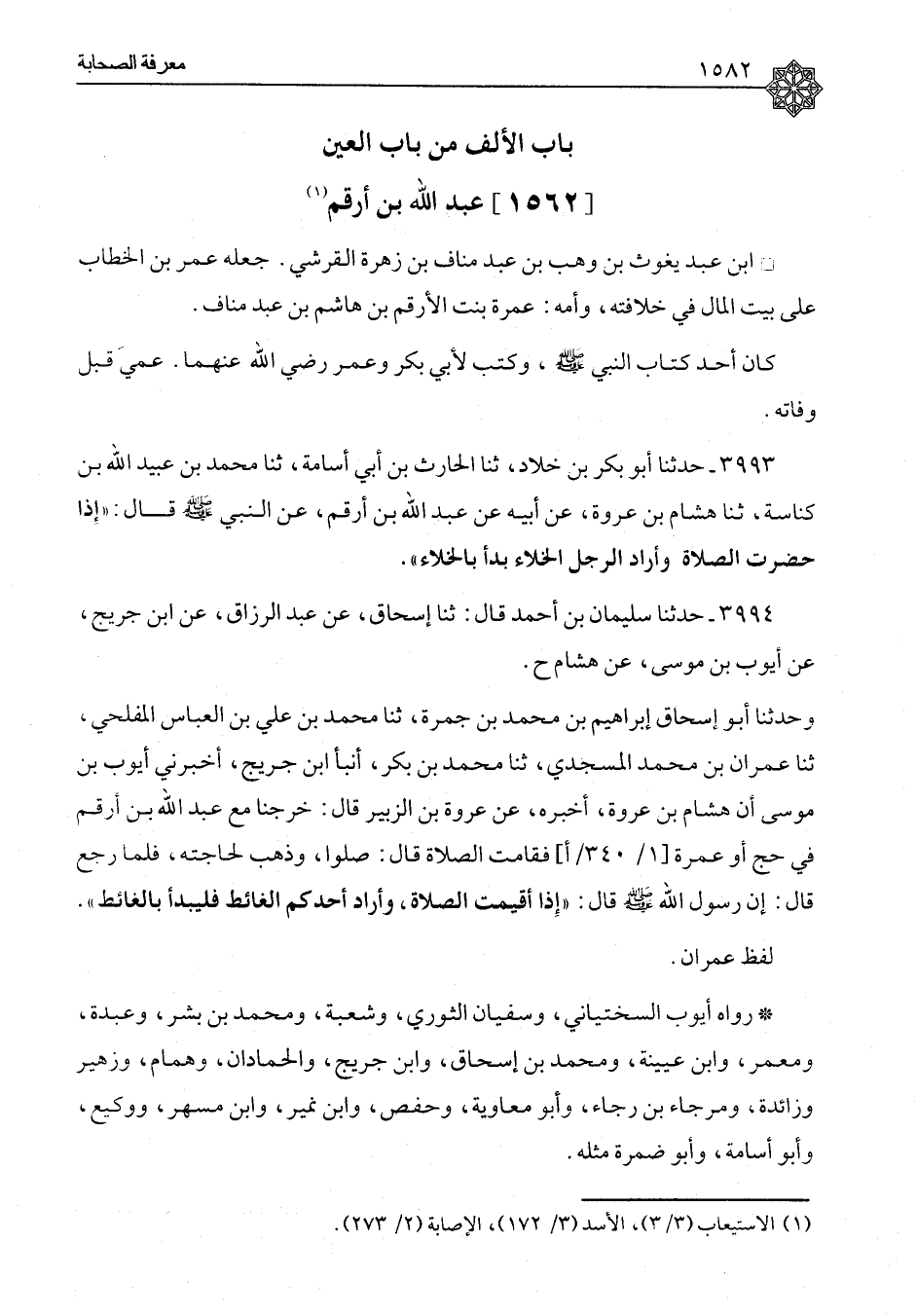 ٣٩٩٤ - حَدَّثَنَا سُلَيْمَانُ بْنُ أَحْمَدَ، قَالَ: ثنا إِسْحَاقُ، عَنْ عَبْدِ الرَّزَّاقِ، عَنِ ابْنِ جُرَيْجٍ، عَنْ أَيُّوبَ بْنِ مُوسَى، عَنْ هِشَامٍ، ح وَحَدَّثَنَا أَبُو إِسْحَاقَ إِبْرَاهِيمُ بْنُ مُحَمَّدِ بْنِ جَمْرَةَ، ثنا مُحَمَّدُ بْنُ عَلِيِّ بْنِ الْعَبَّاسِ الْمُفْلِحِيُّ، ثنا عِمْرَانُ بْنُ مُحَمَّدِ الْمَسْجِدِيُّ، ثنا مُحَمَّدُ بْنُ بَكْرٍ، أنبأ ابْنُ جُرَيْجٍ، أَخْبَرَنِي أَيُّوبُ بْنُ مُوسَى، أَنَّ هِشَامَ بْنَ عُرْوَةَ، أَخْبَرَهُ عَنْ عُرْوَةَ بْنِ الزُّبَيْرِ، قَالَ: خَرَجْنَا مَعَ عَبْدِ اللهِ بْنِ أَرْقَمَ فِي حَجٍّ أَوْ عُمْرَةٍ فَقَامَتِ الصَّلَاةُ قَالَ: صَلُّوا وَذَهَبَ لِحَاجَتِهِ، فَلَمَّا رَجَعَ قَالَ: إِنَّ رَسُولَ اللهِ صَلَّى اللَّهُ عَلَيْهِ وَسَلَّمَ قَالَ: «إِذَا أُقِيمَتِ الصَّلَاةُ، وَأَرَادَ أَحَدُكُمُ الْغَائِطَ فَلْيَبْدَأْ بِالْغَائِطِ» لَفْظُ عِمْرَانُ، رَوَاهُ أَيُّوبُ السَّخْتِيَانِيُّ، وَسُفْيَانُ الثَّوْرِيُّ، وَشُعْبَةُ، وَمُحَمَّدُ بْنُ بِشْرٍ، وَعَبْدَةُ، وَمَعْمَرٌ، وَابْنُ عُيَيْنَةَ، وَمُحَمَّدُ بْنُ إِسْحَاقَ، وَابْنُ جُرَيْجٍ، وَالْحَمَّادَانِ، وَهَمَّامٌ، وَزُهَيْرٌ وَزَائِدَةُ، وَمُرْجَاءُ بْنُ رَجَاءٍ، وَأَبُو مُعَاوِيَةَ، وَحَفْصٌ، وَابْنُ نُمَيْرٍ، وَابْنُ مُسْهِرٍ، وَوَكِيعٌ، وَأَبُو أُسَامَةَ، وَأَبُو ضَمْرَةَ مِثْلَهُ، ⦗١٥٨٣⦘ وَرَوَاهُ وُهَيْبٌ، وَابْنُ جُرَيْجٍ، وَشُعَيْبُ بْنُ إِسْحَاقَ، فَقَالُوا عَنْ أَبِيهِ عَنْ رَجُلٍ، عَنْ عَبْدِ اللهِ بْنِ أَرْقَمَ، وَرَوَاهُ أَبُو مَعْشَرٍ، عَنْ هِشَامِ بْنِ عُرْوَةَ، عَنْ أَبِيهِ، عَنْ عَائِشَةَ، وَرَوَاهُ أَبُو الْأَسْوَدِ، عَنْ عُرْوَةَ