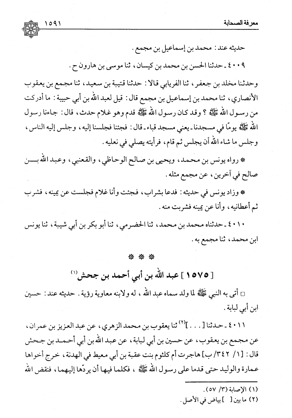 ٤٠٠٩ - حَدَّثَنَا الْحَسَنُ بْنُ مُحَمَّدِ بْنِ كَيْسَانَ، ثنا مُوسَى بْنُ هَارُونَ، ح وَحَدَّثَنَا مَخْلَدُ بْنُ جَعْفَرٍ، ثنا الْفِرْيَابِيُّ، قَالَا: حَدَّثَنَا قُتَيْبَةُ بْنُ سَعِيدٍ، ثنا مُجَمِّعُ بْنُ يَعْقُوبَ الْأَنْصَارِيُّ، ثنا مُحَمَّدُ بْنُ إِسْمَاعِيلَ بْنِ مُجَمِّعٍ، قَالَ: قِيلَ لِعَبْدِ اللهِ بْنِ أَبِي حَبِيبَةَ مَا أَدْرَكْتَ مِنْ رَسُولِ اللهِ صَلَّى اللَّهُ عَلَيْهِ وَسَلَّمَ؟ وَقَدْ كَانَ رَسُولُ اللهِ صَلَّى اللَّهُ عَلَيْهِ وَسَلَّمَ قَدِمَ وَهُوَ غُلَامٌ حَدَثٌ قَالَ: جَاءَنَا رَسُولُ اللهِ صَلَّى اللَّهُ عَلَيْهِ وَسَلَّمَ يَوْمًا فِي مَسْجِدِنَا - يَعْنِي مَسْجِدَ قُبَاءَ - قَالَ: فَجِئْنَا فَجَلَسْنَا إِلَيْهِ، وَجَلَسَ إِلَيْهِ النَّاسُ، وَجَلَسَ مَا شَاءَ اللهُ أَنْ يَجْلِسَ ثُمَّ قَامَ، فَرَأَيْتُهُ يُصَلِّي فِي نَعْلَيْهِ رَوَاهُ يُونُسُ بْنُ مُحَمَّدٍ، وَيَحْيَى بْنُ صَالِحٍ الْوُحَاظِيُّ، وَالْقَعْنَبِيُّ، وَعَبْدُ اللهِ بْنُ صَالِحٍ فِي آخَرِينَ، عَنْ مُجَمِّعٍ مِثْلَهُ وَزَادَ يُونُسُ فِي حَدِيثِهِ: «فَدَعَا بِشَرَابٍ، فَجِئْتُ وَأَنَا غُلَامٌ فَجَلَسْتُ عَنْ يَمِينِهِ، فَشَرِبَ ثُمَّ أَعْطَانِيهِ، وَأَنَا عَنْ يَمِينِهِ فَشَرِبْتُ مِنْهُ»