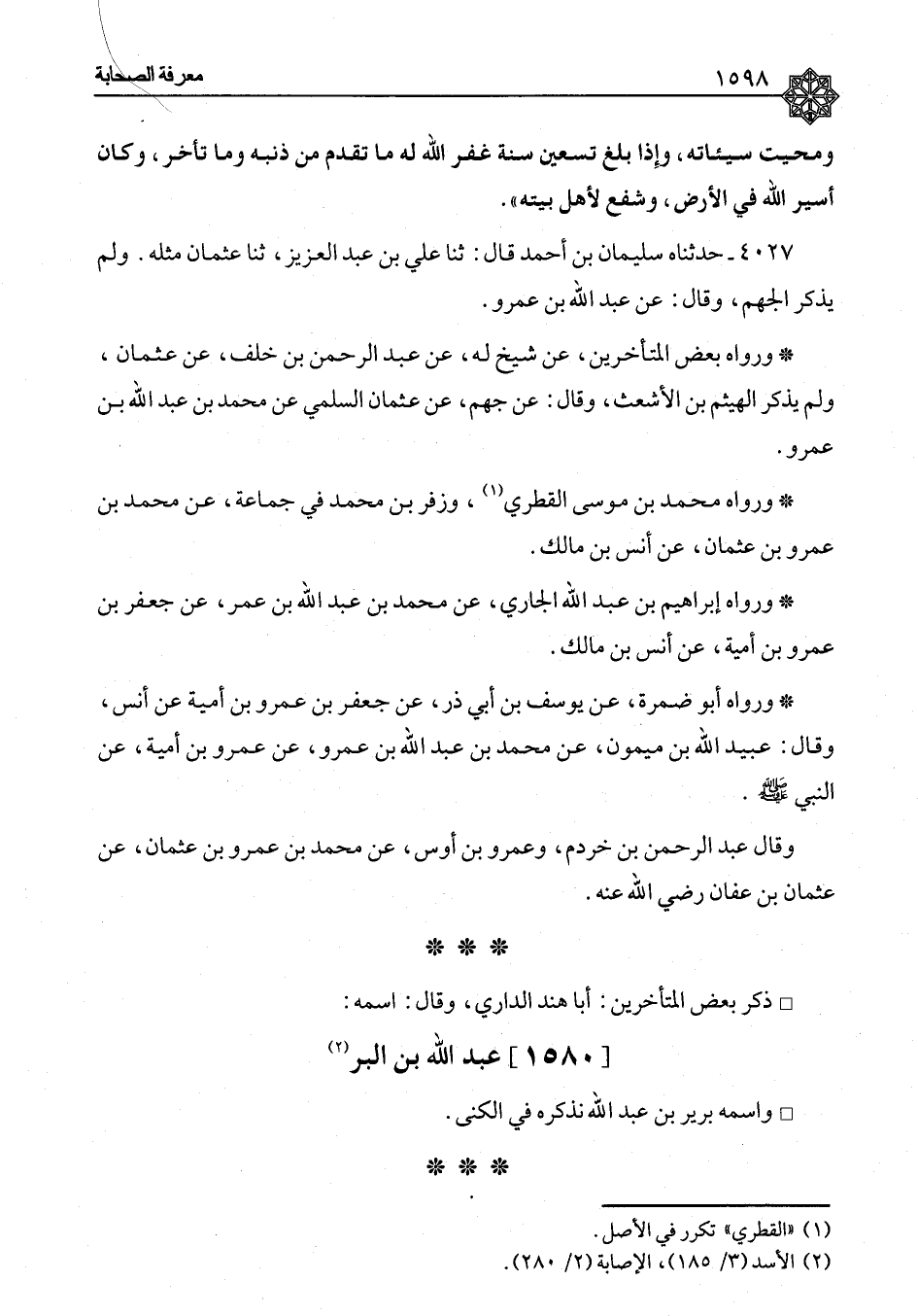 ذَكَرَ بَعْضُ الْمُتَأَخِّرِينَ: أَبَا هِنْدٍ الدَّارِيَّ، وَقَالَ: اسْمُهُ: عَبْدُ اللهِ بْنُ الْبَرِّ وَاسْمُهُ بُرَيْرُ بْنُ عَبْدِ اللهِ نَذْكُرُهُ فِي الْكُنَى