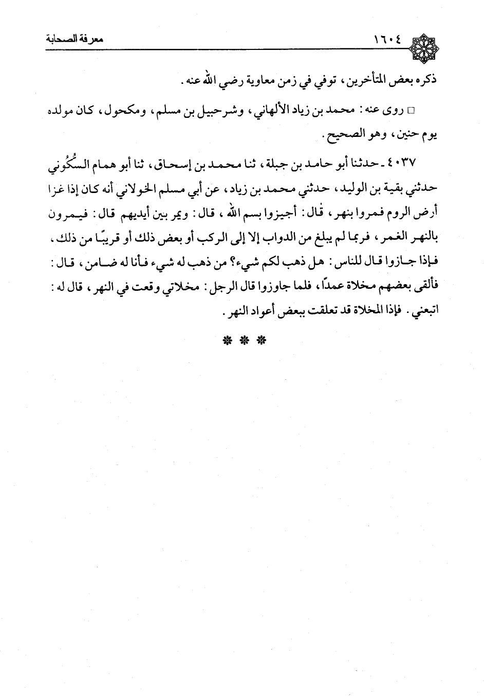 ٤٠٣٧ - حَدَّثَنَا أَبُو حَامِدِ بْنُ جَبَلَةَ، ثنا مُحَمَّدُ بْنُ إِسْحَاقَ، ثنا أَبُو هَمَّامٍ السَّكُونِيُّ، حَدَّثَنِي بَقِيَّةُ بْنُ الْوَلِيدِ، حَدَّثَنِي مُحَمَّدُ بْنُ زِيَادٍ، عَنْ أَبِي مُسْلِمٍ الْخَوْلَانِيِّ، أَنَّهُ كَانَ إِذَا غَزَا أَرْضَ الرُّومِ فَمَرُّوا بِنَهْرٍ قَالَ: أَجِيزُوا بِسْمِ اللهِ قَالَ: وَيَمُرُّ بَيْنَ أَيْدِيهِمْ قَالَ: فَيَمُرُّونَ بِالنَّهْرِ الْغَمْرِ، فَرُبَّمَا لَمْ يَبْلُغْ مِنَ الدَّوَابِّ إِلَّا إِلَى الرُّكَبِ أَوْ بَعْضِ ذَلِكَ أَوْ قَرِيبًا مِنْ ذَلِكَ، فَإِذَا جَازُوا قَالَ لِلنَّاسِ: هَلْ ذَهَبَ لَكُمْ شَيْءٌ؟ مَنْ ذَهَبَ لَهُ شَيْءٌ فَأَنَا لَهُ ضَامِنٌ قَالَ: فَأَلْقَى بَعْضُهُمْ مِخْلَاةً عَمْدًا، فَلَمَّا جَاوَزُوا قَالَ الرَّجُلُ: مِخْلَاتِي وَقَعَتْ فِي النَّهْرِ قَالَ لَهُ: اتَّبِعْنِي، فَإِذَا الْمِخْلَاةُ قَدْ تَعَلَّقَتْ بِبَعْضِ أَعْوَادِ النَّهْرِ