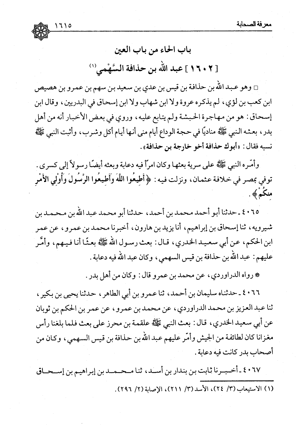 عَبْدُ اللهِ بْنُ حُذَافَةَ السَّهْمِيُّ وَهُوَ عَبْدُ اللهِ بْنُ حُذَافَةَ بْنِ قَيْسِ بْنِ عَدِيِّ بْنِ سَعِيدِ بْنِ سَهْمِ بْنِ عَمْرِو بْنِ هُصَيْصِ بْنِ كَعْبِ بْنِ لُؤَيٍّ، لَمْ يَذْكُرْهُ عُرْوَةُ وَلَا ابْنُ شِهَابٍ وَلَا ابْنُ إِسْحَاقَ فِي الْبَدْرِيِّينَ، وَقَالَ ابْنُ إِسْحَاقَ: هُوَ مِنْ مُهَاجِرَةِ الْحَبَشَةِ وَلَمْ يُتَابَعْ عَلَيْهِ، وَرُوِيَ فِي بَعْضِ الْأَخْبَارِ أَنَّهُ مِنْ أَهْلِ بَدْرٍ، بَعَثَهُ النَّبِيُّ صَلَّى اللَّهُ عَلَيْهِ وَسَلَّمَ مُنَادِيًا فِي حَجَّةِ الْوَدَاعِ أَيَّامَ مِنًى أَنَّهَا أَيَّامُ أَكَلٍ وَشُرْبٍ، وَأَثْبَتَ النَّبِيُّ صَلَّى اللَّهُ عَلَيْهِ وَسَلَّمَ نَسَبَهُ فَقَالَ: «أَبُوكَ حُذَافَةُ» أَخُو خَارِجَةَ بْنِ حُذَافَةَ، وَأَمَّرَهُ النَّبِيُّ صَلَّى اللَّهُ عَلَيْهِ وَسَلَّمَ عَلَى سَرِيَّةٍ بَعَثَهَا وَكَانَ امْرَأً فِيهِ دُعَابَةٌ وَبَعْثَهُ أَيْضًا رَسُولًا إِلَى كِسْرَى، تُوُفِّيَ بِمِصْرَ فِي خِلَافَةِ عُثْمَانَ، وَنَزَلَتْ فِيهِ {أَطِيعُوا اللهَ وَأَطِيعُوا الرَّسُولَ وَأُولِي الْأَمْرِ مِنْكُمْ} [النساء: ٥٩]