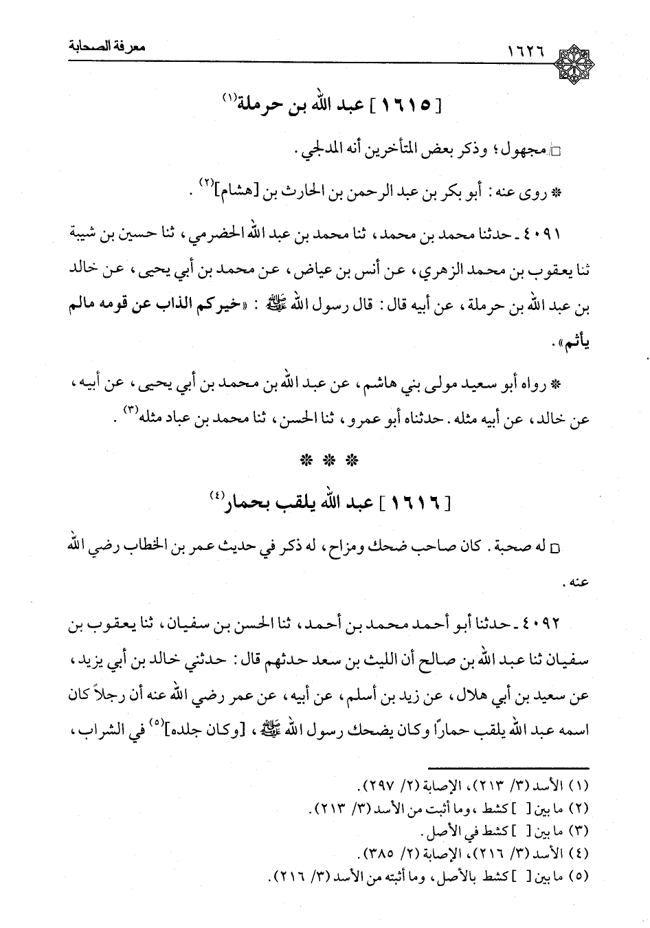 ٤٠٩٢ - حَدَّثَنَا أَبُو أَحْمَدَ مُحَمَّدُ بْنُ أَحْمَدَ، ثنا الْحَسَنُ بْنُ سُفْيَانَ، ثنا يَعْقُوبُ بْنُ سُفْيَانَ، ثنا عَبْدُ اللهِ بْنُ صَالِحٍ، أَنَّ اللَّيْثَ بْنَ سَعْدٍ، حَدَّثَهُمْ قَالَ: حَدَّثَنِي خَالِدُ بْنُ أَبِي يَزِيدَ، عَنْ سَعِيدِ بْنِ أَبِي هِلَالٍ، عَنْ زَيْدِ بْنِ أَسْلَمَ، عَنْ أَبِيهِ، عَنْ عُمَرَ، رَضِيَ اللهُ عَنْهُ أَنَّ رَجُلًا كَانَ اسْمُهُ عَبْدَ اللهِ يُلَقَّبُ حِمَارًا وَكَانَ يُضْحِكُ رَسُولَ اللهِ صَلَّى اللَّهُ عَلَيْهِ وَسَلَّمَ، وَكَانَ جَلَدَهُ فِي الشَّرَابِ، ⦗١٦٢٧⦘ فَأُتِيَ بِهِ يَوْمًا فَجَلَدَهُ فَقَالَ رَجُلٌ مِنَ الْقَوْمِ: اللهُمَّ الْعَنْهُ، مَا أَكْثَرَ مَا يُؤْتَى بِهِ رَسُولُ اللهِ صَلَّى اللَّهُ عَلَيْهِ وَسَلَّمَ فَقَالَ النَّبِيُّ صَلَّى اللَّهُ عَلَيْهِ وَسَلَّمَ: «لَا تَلْعَنْهُ، فَوَاللهِ مَا عَلِمْتَ أَنَّهُ يُحِبُّ اللهَ وَرَسُولَهُ» وَرَوَاهُ عَبْدُ اللهِ بْنُ نُمَيْرٍ، عَنْ هِشَامِ بْنِ سَعْدٍ، عَنْ زَيْدِ بْنِ أَسْلَمَ