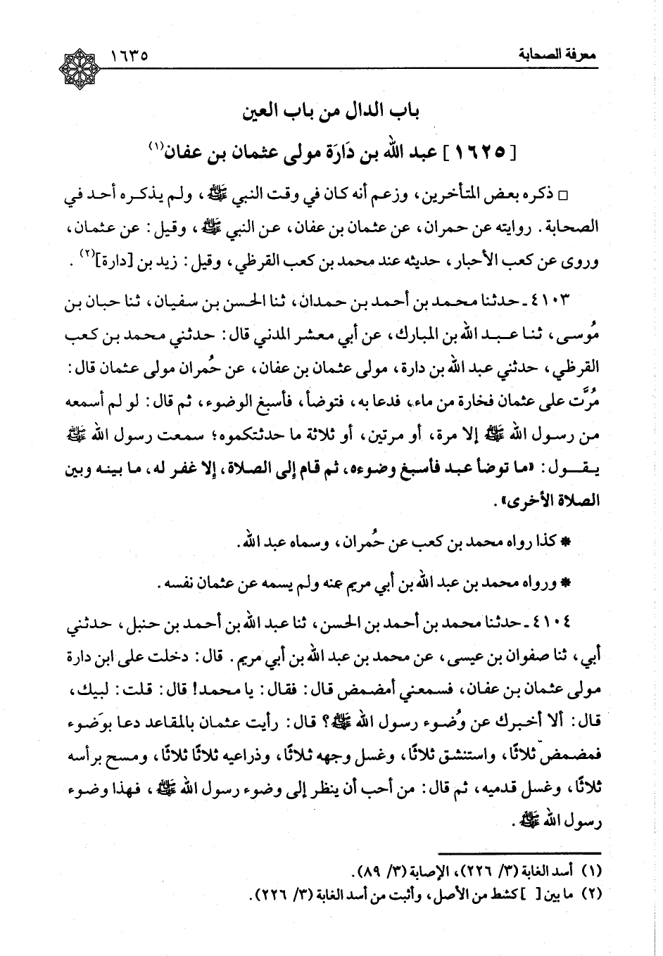 عَبْدُ اللهِ بْنُ دَارَةَ مَوْلَى عُثْمَانَ بْنِ عَفَّانَ ذَكَرَهُ بَعْضُ الْمُتَأَخِّرِينَ، وَزَعَمَ أَنَّهُ كَانَ فِي وَقْتِ النَّبِيِّ صَلَّى اللَّهُ عَلَيْهِ وَسَلَّمَ، وَلَمْ يَذْكُرْهُ أَحَدٌ فِي الصَّحَابَةِ، رِوَايَتُهُ عَنْ حُمْرَانَ، عَنْ عُثْمَانَ بْنِ عَفَّانَ، عَنِ النَّبِيِّ صَلَّى اللَّهُ عَلَيْهِ وَسَلَّمَ، وَقِيلَ: عَنْ عُثْمَانَ، وَرَوَى عَنْ كَعْبِ الْأَحْبَارِ، حَدِيثُهُ عِنْدَ مُحَمَّدِ بْنِ كَعْبٍ الْقُرَظِيِّ وَقِيلَ: زَيْدُ بْنُ دَارَةَ