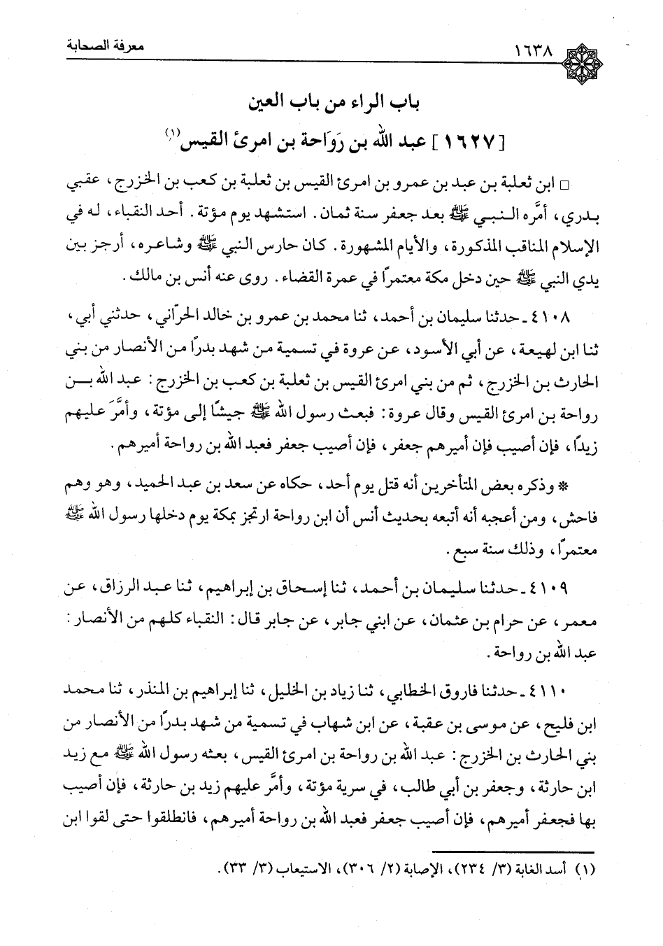 عَبْدُ اللهِ بْنُ رَوَاحَةَ بْنِ امْرِئِ الْقَيْسِ بْنِ ثَعْلَبَةَ بْنِ عَبْدِ بْنِ عَمْرِو بْنِ امْرِئِ الْقَيْسِ بْنِ ثَعْلَبَةَ بْنِ كَعْبِ بْنِ الْخَزْرَجِ، عَقَبِيٌّ بَدْرِيٌّ، أَمَّرَهُ النَّبِيُّ صَلَّى اللَّهُ عَلَيْهِ وَسَلَّمَ بَعْدَ جَعْفَرٍ سَنَةَ ثَمَانٍ، اسْتُشْهِدَ يَوْمَ مُؤْتَةَ أَحَدُ النُّقَبَاءِ، لَهُ فِي الْإِسْلَامِ الْمَنَاقِبُ الْمَذْكُورَةُ، وَالْأَيَّامُ الْمَشْهُورَةُ كَانَ حَارِسَ النَّبِيِّ صَلَّى اللَّهُ عَلَيْهِ وَسَلَّمَ وَشَاعِرَهُ، أَرْجَزَ بَيْنَ يَدَيِ النَّبِيِّ صَلَّى اللَّهُ عَلَيْهِ وَسَلَّمَ حِينَ دَخَلَ مَكَّةَ مُعْتَمِرًا فِي عُمْرَةِ الْقَضَاءِ، رَوَى عَنْهُ أَنَسُ بْنُ مَالِكٍ
