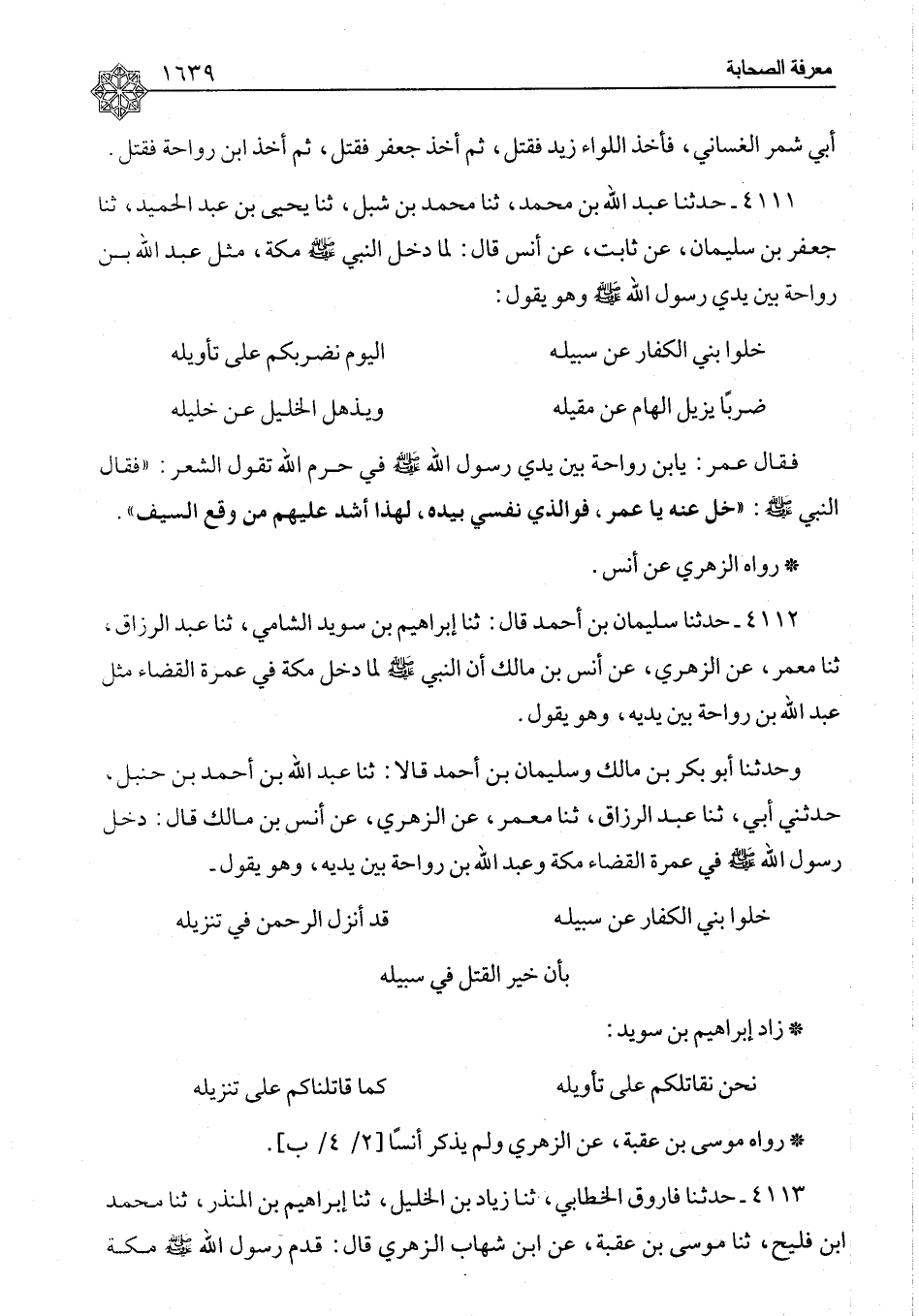 ٤١١٣ - حَدَّثَنَا فَارُوقٌ الْخَطَّابِيُّ، ثنا زِيَادُ بْنُ الْخَلِيلِ، ثنا إِبْرَاهِيمُ بْنُ الْمُنْذِرِ، ثنا مُحَمَّدُ بْنُ فُلَيْحٍ، ثنا مُوسَى بْنُ عُقْبَةَ، عَنِ ابْنِ شِهَابٍ الزُّهْرِيِّ، قَالَ: قَدِمَ رَسُولُ اللهِ صَلَّى اللَّهُ عَلَيْهِ وَسَلَّمَ مَكَّةَ ⦗١٦٤٠⦘ مُعْتَمِرًا فِي ذِي الْقَعْدَةِ مِنْ سَنَةَ سَبْعٍ فَأَمَرَ أَصْحَابَهُ فَقَالَ: «اكْشِفُوا عَنِ الْمَنَاكِبِ وَاسْعَوْا لِلطَّوَافِ» ، وَعَبْدُ اللهِ بْنُ رَوَاحَةَ يَرْتَجِزُ بَيْنَ يَدَيْ رَسُولِ اللهِ صَلَّى اللَّهُ عَلَيْهِ وَسَلَّمَ مُتَوَشِّحٌ السَّيْفَ، وَهُوَ يَقُولُ: