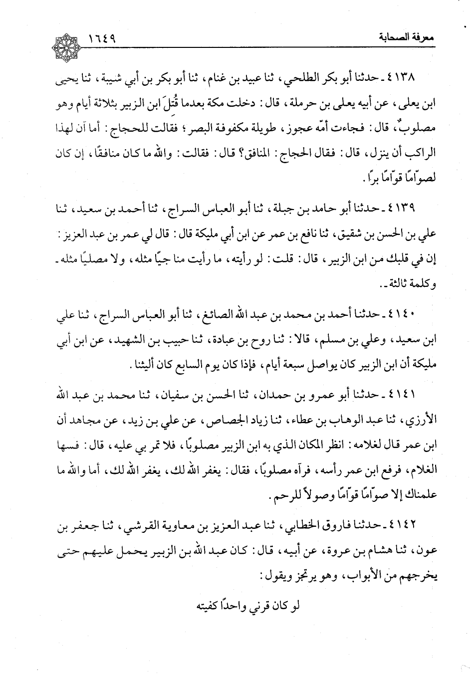 ٤١٤١ - حَدَّثَنَا أَبُو عَمْرِو بْنُ حَمْدَانَ، ثنا الْحَسَنُ بْنُ سُفْيَانَ، ثنا مُحَمَّدُ بْنُ عَبْدِ اللهِ الْأَرُزِّيُّ، ثنا عَبْدُ الْوَهَّابِ بْنُ عَطَاءٍ، ثنا زِيَادٌ الْجَصَّاصُ، عَنْ عَلِيِّ بْنِ زَيْدٍ، عَنْ مُجَاهِدٍ، أَنَّ ابْنَ عُمَرَ قَالَ لِغُلَامِهِ: انْظُرِ الْمَكَانَ الَّذِي بِهِ ابْنُ الزُّبَيْرِ مَصْلُوبًا، فَلَا تَمُرَّ بِي عَلَيْهِ، قَالَ: فَسَهَا الْغُلَامُ، فَرَفَعَ ابْنُ عُمَرَ رَأْسَهُ، فَرَآهُ مَصْلُوبًا فَقَالَ: يَغْفِرُ اللهُ لَكَ، يَغْفِرُ اللهُ لَكَ، أَمَا وَاللهِ مَا عَلِمْنَاكَ إِلَّا صَوَّامًا قَوَّامًا وَصُولًا لِلرَّحِمِ