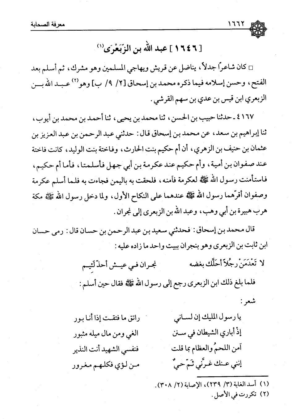 عَبْدُ اللهِ بْنُ الزِّبَعْرَى كَانَ شَاعِرًا جَدِلًا، يُنَاضِلُ عَنْ قُرَيْشٍ وَيُهَاجِي الْمُسْلِمِينَ وَهُوَ مُشْرِكٌ، ثُمَّ أَسْلَمَ بَعْدَ الْفَتْحِ، وَحَسُنَ إِسْلَامُهُ فِيمَا ذَكَرَهُ مُحَمَّدُ بْنُ إِسْحَاقَ وَهُوَ عَبْدُ اللهِ بْنُ الزِّبَعْرَى بْنِ قَيْسِ بْنِ عَدِيِّ بْنِ سَهْمٍ الْقُرَشِيُّ