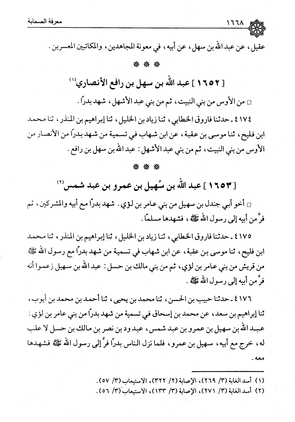 ٤١٧٦ - حَدَّثَنَا حَبِيبُ بْنُ الْحَسَنِ، ثنا مُحَمَّدُ بْنُ يَحْيَى، ثنا أَحْمَدُ بْنُ مُحَمَّدِ بْنِ أَيُّوبَ، ثنا إِبْرَاهِيمُ بْنُ سَعْدٍ، عَنْ مُحَمَّدِ بْنِ إِسْحَاقَ، فِي تَسْمِيَةِ مَنْ شَهِدَ بَدْرًا مِنْ بَنِي عَامِرِ بْنِ لُؤَيٍّ: عَبْدُ اللهِ بْنُ سُهَيْلِ بْنِ عَمْرِو بْنِ عَبْدِ شَمْسِ بْنِ عَبْدِ وَدِّ بْنُ نَصْرِ بْنِ مَالِكِ بْنِ حِسْلٍ لَا عَقِبَ لَهُ، خَرَجَ مَعَ أَبِيهِ سُهَيْلِ بْنِ عَمْرٍو، فَلَمَّا نَزَلَ النَّاسُ بَدْرًا فَرَّ إِلَى رَسُولِ اللهِ صَلَّى اللَّهُ عَلَيْهِ وَسَلَّمَ فَشَهِدَهَا مَعَهُ ⦗١٦٦٩⦘ كَرَّرَهُ بَعْضُ الْمُتَأَخِّرِينَ فَجَعَلَهُ تَرْجَمَتَيْنِ، عَنْ وَهْبِ بْنِ جَرِيرٍ، عَنْ أَبِيهِ عَنِ ابْنِ إِسْحَاقَ، وَعَنْ يُونُسَ بْنِ بُكَيْرٍ، عَنِ ابْنِ إِسْحَاقَ، فَمَرَّةً قَالَ: عَبْدُ اللهِ بْنُ سُهَيْلِ بْنِ عَمْرِو بْنِ عَبْدِ شَمْسٍ الْقُرَشِيٌّ، وَمَرَّةً قَالَ: عَبْدُ اللهِ بْنُ سُهَيْلٍ أَخُو أَبِي جَنْدَلِ بْنِ سُهَيْلٍ، وَهُمَا وَاحِدٌ