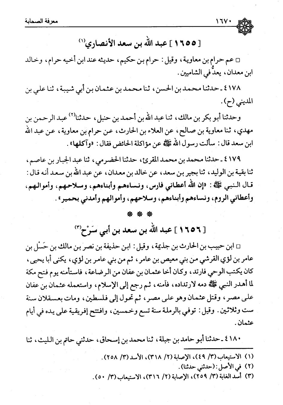 عَبْدُ اللهِ بْنُ سَعْدٍ الْأَنْصَارِيُّ عَمُّ حَرَامِ بْنِ مُعَاوِيَةَ، وَقِيلَ: حَرَامُ بْنُ حَكِيمٍ حَدِيثُهُ عِنْدَ ابْنِ أَخِيهِ حَرَامٍ، وَخَالِدِ بْنِ مَعْدَانَ، يُعَدُّ فِي الشَّامِيِّينَ
