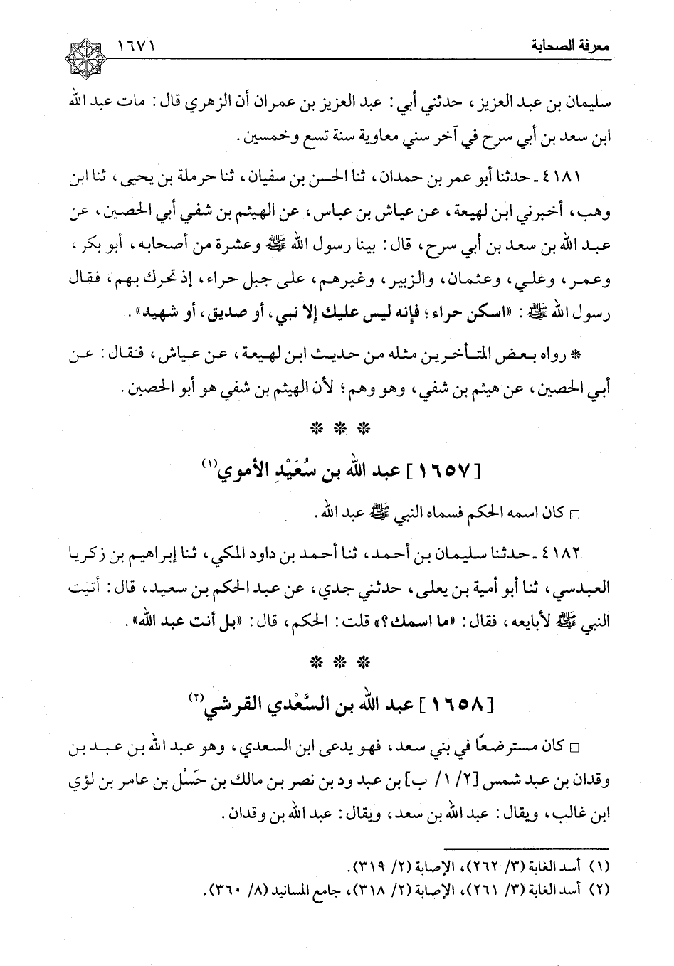 ٤١٨١ - حَدَّثَنَا أَبُو عُمَرَ بْنُ حَمْدَانَ، ثنا الْحَسَنُ بْنُ سُفْيَانَ، ثنا حَرْمَلَةُ بْنُ يَحْيَى، ثنا ابْنُ وَهْبٍ، أَخْبَرَنِي ابْنُ لَهِيعَةَ، عَنْ عَيَّاشِ بْنِ عَبَّاسٍ، عَنِ الْهَيْثَمِ بْنِ شُفَيٍّ أَبِي الْحُصَيْنِ، عَنْ عَبْدِ اللهِ بْنِ سَعْدِ بْنِ أَبِي سَرْحٍ، قَالَ: بَيْنَا رَسُولُ اللهِ صَلَّى اللَّهُ عَلَيْهِ وَسَلَّمَ وَعَشَرَةٌ مِنْ أَصْحَابِهِ، أَبُو بَكْرٍ، وَعُمَرُ، وَعَلِيٌّ، وَعُثْمَانُ، وَالزُّبَيْرُ، وَغَيْرُهُمْ عَلَى جَبَلِ حِرَاءٍ، إِذْ تَحَرَّكَ بِهِمْ فَقَالَ رَسُولُ اللهِ صَلَّى اللَّهُ عَلَيْهِ وَسَلَّمَ: «اسْكُنْ حِرَاءُ، فَإِنَّهُ لَيْسَ عَلَيْكَ إِلَّا نَبِيٌّ، أَوْ صِدِّيقٌ، أَوْ شَهِيدٌ» رَوَاهُ بَعْضُ الْمُتَأَخِّرِينَ مِثْلَهُ مِنْ حَدِيثِ ابْنِ لَهِيعَةَ، عَنْ عَيَّاشٍ فَقَالَ: عَنْ أَبِي الْحُصَيْنِ، عَنْ هَيْثَمِ بْنِ شُفَيٍّ، وَهُوَ وَهْمٌ، لِأَنَّ الْهَيْثَمَ بْنَ شُفَيٍّ هُوَ أَبُو الْحُصَيْنِ