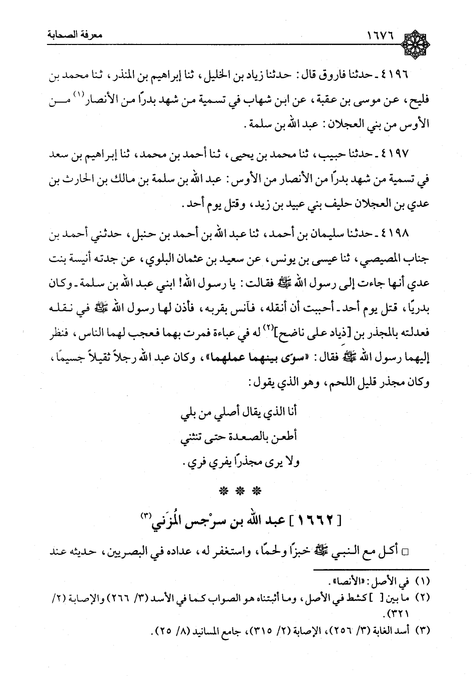 ٤١٩٨ - حَدَّثَنَا سُلَيْمَانُ بْنُ أَحْمَدَ، ثنا عَبْدُ اللهِ بْنُ أَحْمَدَ بْنِ حَنْبَلٍ، حَدَّثَنِي أَحْمَدُ بْنُ جَنَابٍ الْمِصِّيصِيُّ، ثنا عِيسَى بْنُ يُونُسَ، عَنْ سَعِيدِ بْنِ عُثْمَانَ الْبَلَوِيِّ، عَنْ جَدَّتِهِ أُنَيْسَةَ بِنْتِ عَدِيٍّ أَنَّهَا جَاءَتْ إِلَى رَسُولِ اللهِ صَلَّى اللَّهُ عَلَيْهِ وَسَلَّمَ فَقَالَتْ: يَا رَسُولَ اللهِ، ابْنِي عَبْدُ اللهِ بْنُ سَلَمَةَ وَكَانَ بَدْرِيًّا، قُتِلَ يَوْمَ أُحُدٍ أَحْبَبْتُ أَنْ أَنْقُلَهُ فَآنَسُ بِقُرْبِهِ، فَأَذِنَ لَهَا رَسُولُ اللهِ صَلَّى اللَّهُ عَلَيْهِ وَسَلَّمَ فِي نَقْلِهِ فَعَدَلَتْهُ بِالْمُجَذَّرِ بْنِ زِيَادٍ عَلَى نَاضِحٍ لَهُ فِي عَبَاءَةٍ فَمَرَّتْ بِهِمَا فَعَجِبَ لَهُمَا النَّاسُ، فَنَظَرَ إِلَيْهِمَا رَسُولُ اللهِ صَلَّى اللَّهُ عَلَيْهِ وَسَلَّمَ فَقَالَ: «سَوَّى بَيْنَهُمَا عَمَلُهُمَا» ، وَكَانَ عَبْدُ اللهِ رَجُلًا ثَقِيلًا جَسِيمًا، وَكَانَ مُجَذَّرٌ قَلِيلَ اللَّحْمِ، وَهُوَ الَّذِي يَقُولُ: