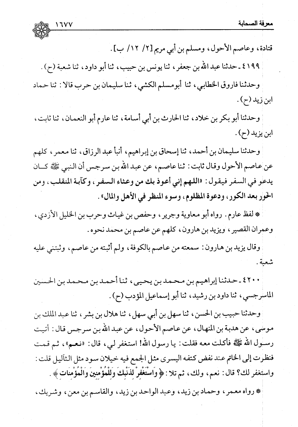 ٤٢٠٠ - حَدَّثَنَا إِبْرَاهِيمُ بْنُ مُحَمَّدِ بْنِ يَحْيَى، ثنا أَحْمَدُ بْنُ مُحَمَّدِ بْنِ الْحُسَيْنِ الْمَاسَرْجَسِيُّ، ثنا دَاوُدُ بْنُ رُشَيْدٍ، ثنا أَبُو إِسْمَاعِيلَ الْمُؤَدِّبُ، ح وَحَدَّثَنَا حَبِيبُ بْنُ الْحَسَنِ، ثنا سَهْلُ بْنُ أَبِي سَهْلٍ، ثنا هِلَالُ بْنُ بِشْرٍ، ثنا عَبْدُ الْمَلِكِ بْنُ مُوسَى، عَنْ هُدْبَةَ بْنِ الْمِنْهَالِ، عَنْ عَاصِمٍ الْأَحْوَلِ، عَنْ عَبْدِ اللهِ بْنِ سَرْجِسَ، قَالَ: أَتَيْتُ رَسُولَ اللهِ صَلَّى اللَّهُ عَلَيْهِ وَسَلَّمَ فَأَكَلْتُ مَعَهُ فَقُلْتُ: يَا رَسُولَ اللهِ اسْتَغْفِرْ لِي قَالَ: «نَعَمْ» ، ثُمَّ قُمْتُ فَنَظَرْتُ إِلَى الْخَاتَمِ عِنْدَ نَفْضِ كَتِفِهِ الْيُسْرَى مِثْلَ الْجَمْعِ فِيهِ خِيلَانٌ سُودٌ مِثْلُ الثَّآلِيلِ قُلْتُ: وَاسْتَغْفَرَ لَكَ؟ قَالَ: نَعَمْ، وَلَكَ، ثُمَّ تَلَا {وَاسْتَغْفِرْ لِذَنْبِكَ وَلِلْمُؤْمِنِينَ وَالْمُؤْمِنَاتِ} [محمد: ١٩] رَوَاهُ مَعْمَرٌ، وَحَمَّادُ بْنُ زَيْدٍ، وَعَبْدُ الْوَاحِدِ بْنُ زَيْدٍ، وَالْقَاسِمُ بْنُ مَعْنٍ، وَشَرِيكٌ، ⦗١٦٧٨⦘ وَالْوَضَّاحُ أَبُو عَوَانَةَ