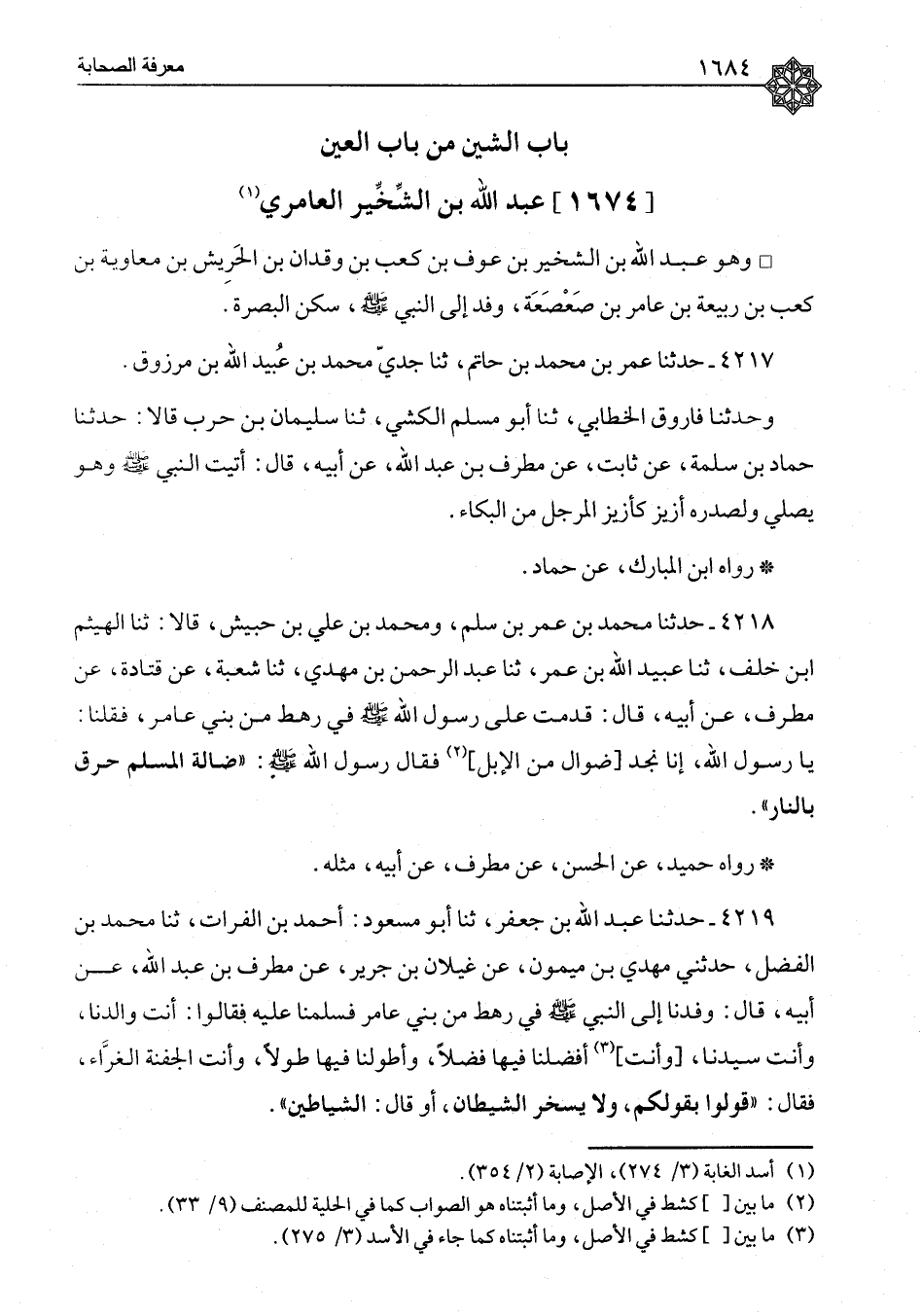 ٤٢١٨ - حَدَّثَنَا مُحَمَّدُ بْنُ عُمَرَ بْنِ سَلْمٍ، وَمُحَمَّدُ بْنُ عَلِيِّ بْنِ حُبَيْشٍ، قَالَا: ثنا الْهَيْثَمُ بْنُ خَلَفٍ، ثنا عُبَيْدُ اللهِ بْنُ عُمَرَ، ثنا عَبْدُ الرَّحْمَنِ بْنُ مَهْدِيٍّ، ثنا شُعْبَةُ، عَنْ قَتَادَةَ، عَنْ مُطَرِّفٍ، عَنْ أَبِيهِ، قَالَ: قَدِمْتُ عَلَى رَسُولِ اللهِ صَلَّى اللَّهُ عَلَيْهِ وَسَلَّمَ فِي رَهْطٍ مِنْ بَنِي عَامِرٍ، فَقُلْنَا: يَا رَسُولَ اللهِ، إِنَّا نَجِدُ ضَوَالَّ مِنَ الْإِبِلِ فَقَالَ رَسُولُ اللهِ صَلَّى اللَّهُ عَلَيْهِ وَسَلَّمَ: «ضَالَّةُ الْمُسْلِمِ حَرْقٌ بِالنَّارِ» رَوَاهُ حُمَيْدٌ، عَنِ الْحَسَنِ، عَنْ مُطَرِّفٍ، عَنْ أَبِيهِ، مِثْلَهُ