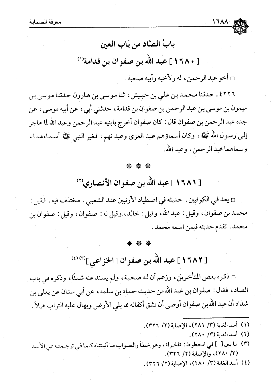 عَبْدُ اللهِ بْنُ صَفْوَانَ الْخُزَاعِيُّ ذَكَرَهُ بَعْضُ الْمُتَأَخِّرِينَ، وَزَعَمَ أَنَّ لَهُ صُحْبَةٌ، وَلَمْ يُسْنِدُ عَنْهُ شَيْئًا، وَذَكَرَهُ فِي بَابِ الصَّادِ فَقَالَ: صَفْوَانُ بْنُ عَبْدِ اللهِ مِنْ حَدِيثِ حَمَّادِ بْنِ سَلَمَةَ، عَنْ أَبِي سِنَانٍ عَنْ يَعْلَى بْنِ شَدَّادٍ أَنَّ عَبْدَ اللهِ بْنَ صَفْوَانَ أَوْصَى أَنْ تُشَقَّ أَكْفَانُهُ مِمَّا يَلِي الْأَرْضِ وَيُهَالَ عَلَيْهِ التُّرَابُ هَيْلًا، ⦗١٦٨٩⦘ وَذَكَرَهُ فِي بَابِ الصَّادِ صَفْوَانُ هَذَا الْحَدِيثَ بِعَيْنِهِ، عَنْ حَمَّادٍ فَقَالَ: عَنْ أَبِي سِنَانٍ، عَنْ عَبْدِ اللهِ بْنِ أُوَيْسٍ، عَنْ صَفْوَانَ بْنِ عَبْدِ اللهِ