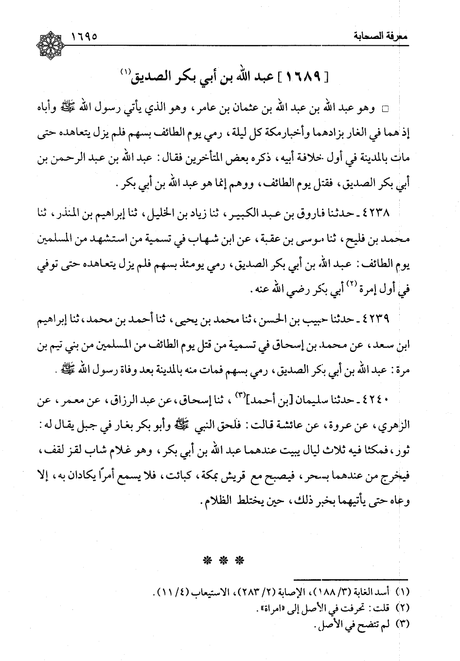 عَبْدُ اللهِ بْنُ أَبِي بَكْرٍ الصِّدِّيقُ وَهُوَ عَبْدُ اللهِ بْنُ عَبْدِ اللهِ بْنِ عُثْمَانَ بْنِ عَامِرٍ، وَهُوَ الَّذِي يَأْتِي رَسُولَ اللهِ صَلَّى اللَّهُ عَلَيْهِ وَسَلَّمَ وَأَبَاهُ إِذْ هُمَا فِي الْغَارِ بِزَادِهِمَا وَأَخْبَارِ مَكَّةَ كُلَّ لَيْلَةٍ، رُمِيَ يَوْمَ الطَّائِفِ بِسَهْمٍ فَلَمْ يَزَلْ يَتَعَاهَدُهُ حَتَّى مَاتَ بِالْمَدِينَةِ فِي أَوَّلِ خِلَافَةِ أَبِيهِ، ذَكَرَهُ بَعْضُ الْمُتَأَخِّرِينَ فَقَالَ: عَبْدُ اللهِ بْنُ عَبْدِ الرَّحْمَنِ بْنِ أَبِي بَكْرٍ الصِّدِّيقِ، فَقُتِلَ يَوْمَ الطَّائِفِ وَوَهِمَ إِنَّمَا هُوَ عَبْدُ اللهِ بْنُ أَبِي بَكْرٍ