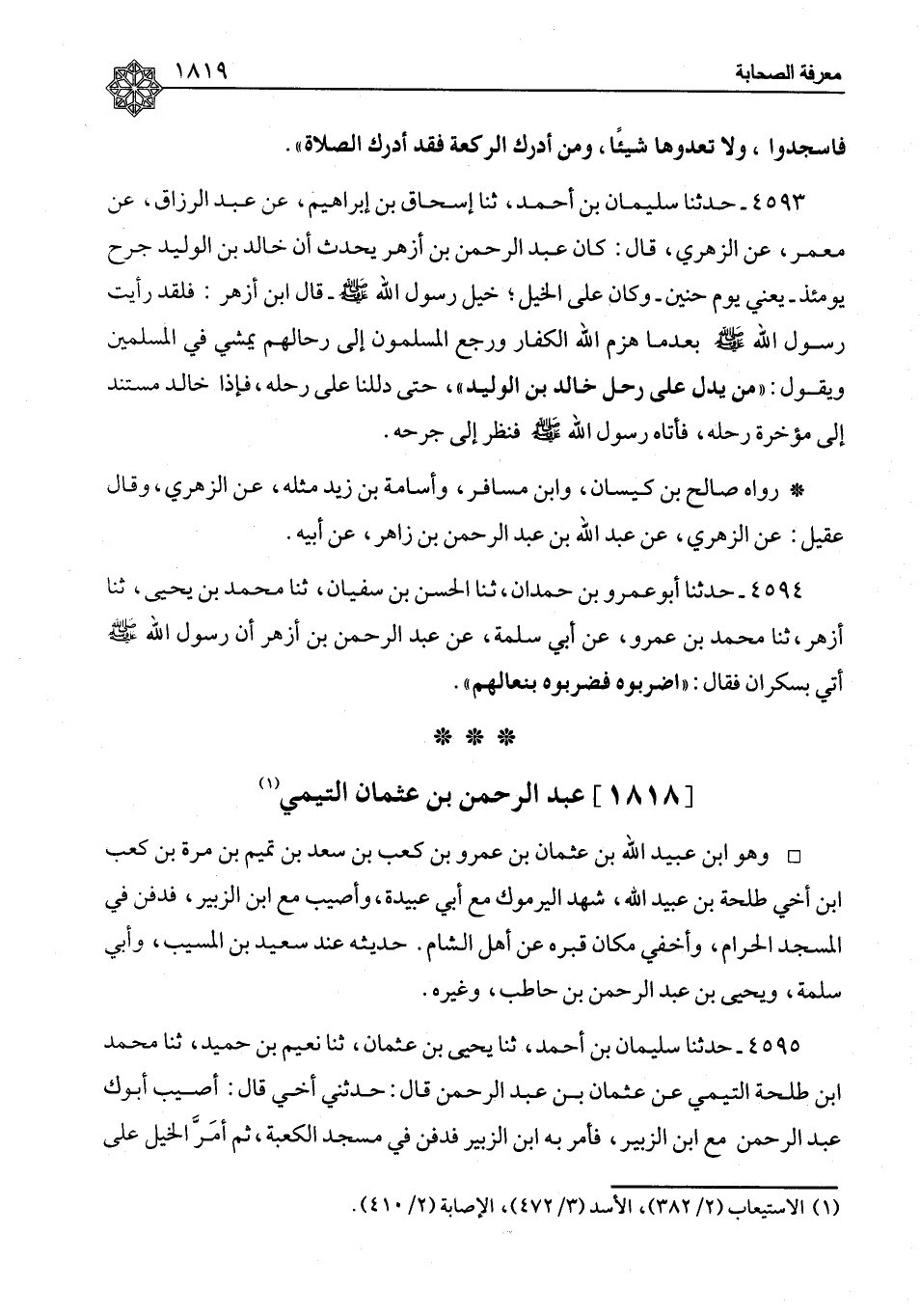 ٤٥٩٣ - حَدَّثَنَا سُلَيْمَانُ بْنُ أَحْمَدَ، ثنا إِسْحَاقُ بْنُ إِبْرَاهِيمَ، عَنْ عَبْدِ الرَّزَّاقِ، عَنْ مَعْمَرٍ، عَنِ الزُّهْرِيِّ، قَالَ: كَانَ عَبْدُ الرَّحْمَنِ بْنُ أَزْهَرَ يُحَدِّثُ أَنَّ خَالِدَ بْنَ الْوَلِيدِ: " جُرِحَ يَوْمَئِذٍ، يَعْنِي يَوْمَ حُنَيْنٍ، وَكَانَ عَلَى الْخَيْلِ خَيْلِ رَسُولِ اللهِ صَلَّى اللَّهُ عَلَيْهِ وَسَلَّمَ، قَالَ ابْنُ أَزْهَرَ: فَلَقَدْ رَأَيْتُ رَسُولَ اللهِ صَلَّى اللَّهُ عَلَيْهِ وَسَلَّمَ بَعْدَمَا هَزَمَ اللهُ الْكُفَّارَ، وَرَجَعَ الْمُسْلِمُونَ إِلَى رِحَالِهِمْ يَمْشِي فِي الْمُسْلِمِينَ، وَيَقُولُ: «مَنْ يَدُلُّ عَلَى رَحْلِ خَالِدِ بْنِ الْوَلِيدِ؟» ، حَتَّى دُلِلْنَا عَلَى رَحْلِهِ، فَإِذَا خَالِدٌ مُسْتَنِدٌ إِلَى مُؤْخِرَةِ رَحْلِهِ، فَأَتَاهُ رَسُولُ اللهِ صَلَّى اللَّهُ عَلَيْهِ وَسَلَّمَ فَنَظَرَ إِلَى جُرْحِهِ " رَوَاهُ صَالِحُ بْنُ كَيْسَانَ، وَابْنُ مُسَافِرٍ، وَأُسَامَةُ بْنُ زَيْدٍ مِثْلَهُ، عَنِ الزُّهْرِيِّ، وَقَالَ عَقِيلٌ: عَنِ الزُّهْرِيِّ، عَنْ عَبْدِ اللهِ بْنِ عَبْدِ الرَّحْمَنِ بْنِ زَاهِرٍ، عَنْ أَبِيهِ