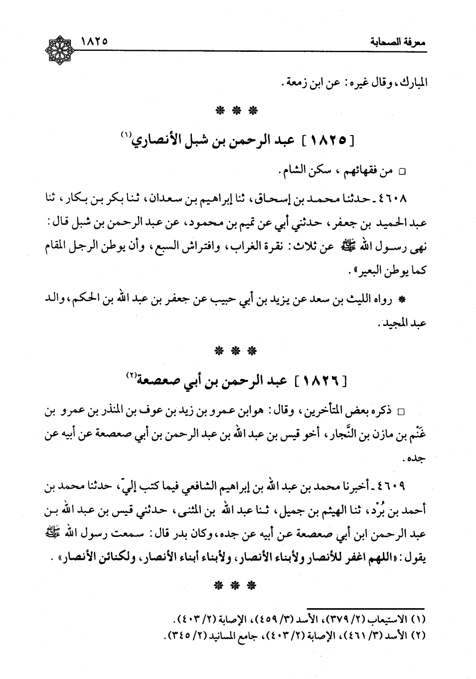 عَبْدُ الرَّحْمَنِ بْنُ شِبْلٍ الْأَنْصَارِيُّ مِنْ فُقَهَائِهِمْ، سَكَنَ الشَّامَ
