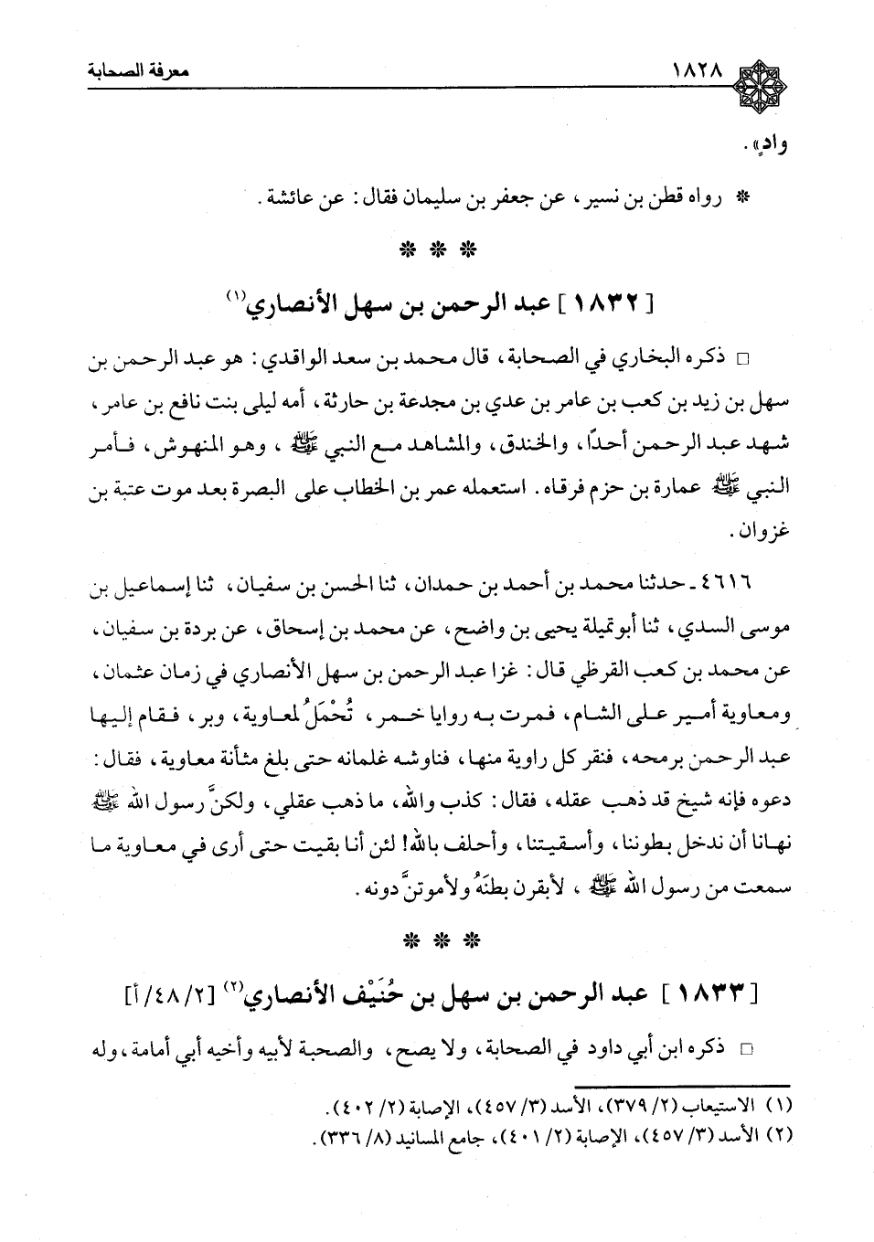 عَبْدُ الرَّحْمَنِ بْنُ سَهْلِ بْنِ حُنَيْفٍ الْأَنْصَارِيُّ ذَكَرَهُ ابْنُ أَبِي دَاوُدَ فِي الصَّحَابَةِ، وَلَا يَصِحُّ، وَالصُّحْبَةُ لِأَبِيهِ وَأَخِيهِ أَبِي أُمَامَةَ، وَلَهُ ⦗١٨٢٩⦘ رُؤْيَةٌ